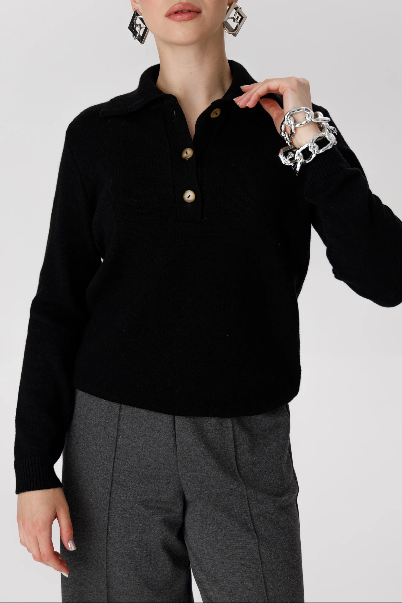 Классический дизайн: Джемпер-поло с пуговицами и ребристыми манжетами придаёт образу аккуратность и элегантность, делая его универсальным для различных стилей.