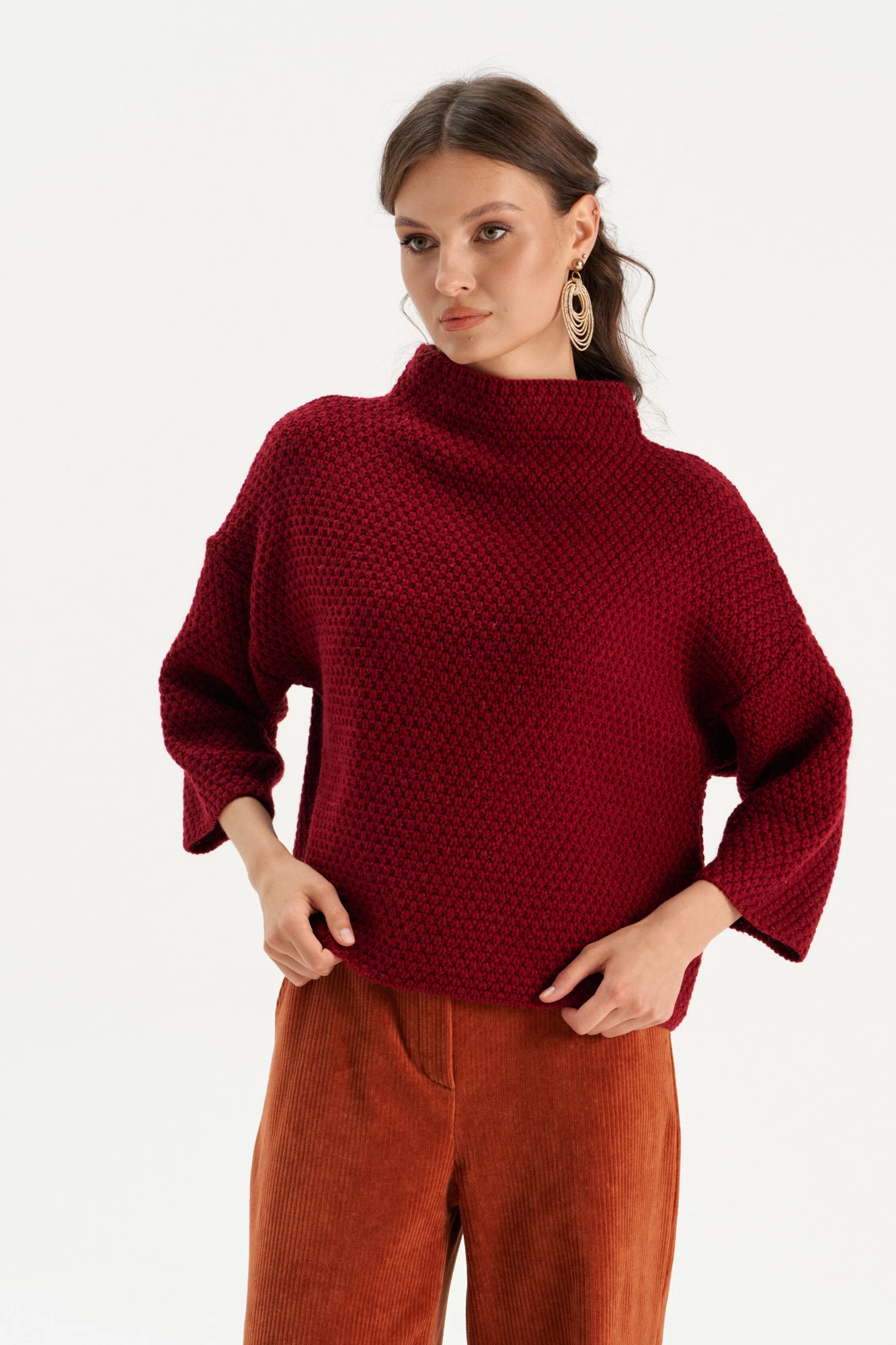 Стильный дизайн: Переплетение соты и простой крой делают этот джемпер универсальным и подходящим для любого случая.