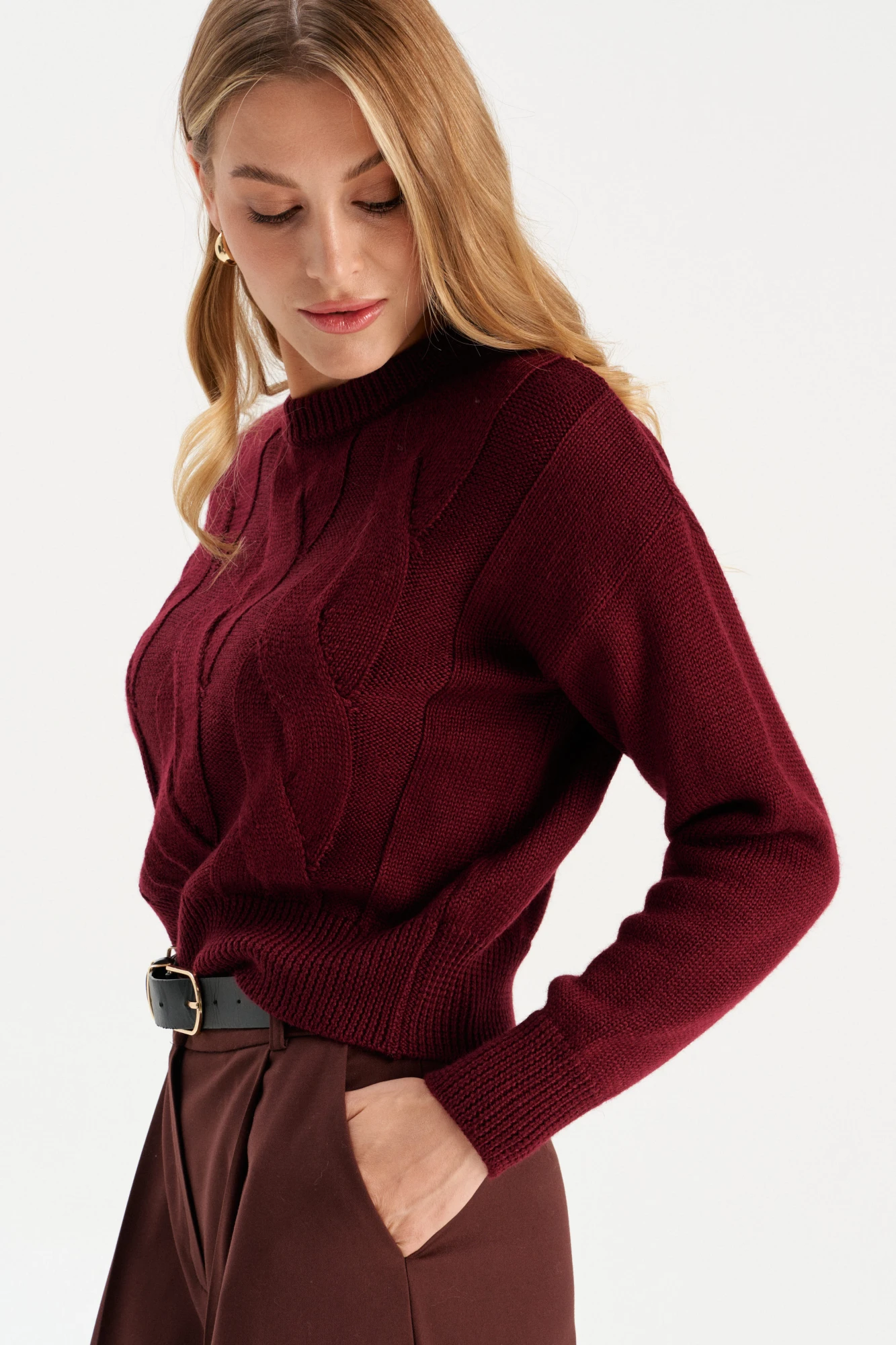 Стильный дизайн: Объёмный узор ""косы"" на передней части и укороченный крой делают джемпер универсальным для создания модных и женственных образов.