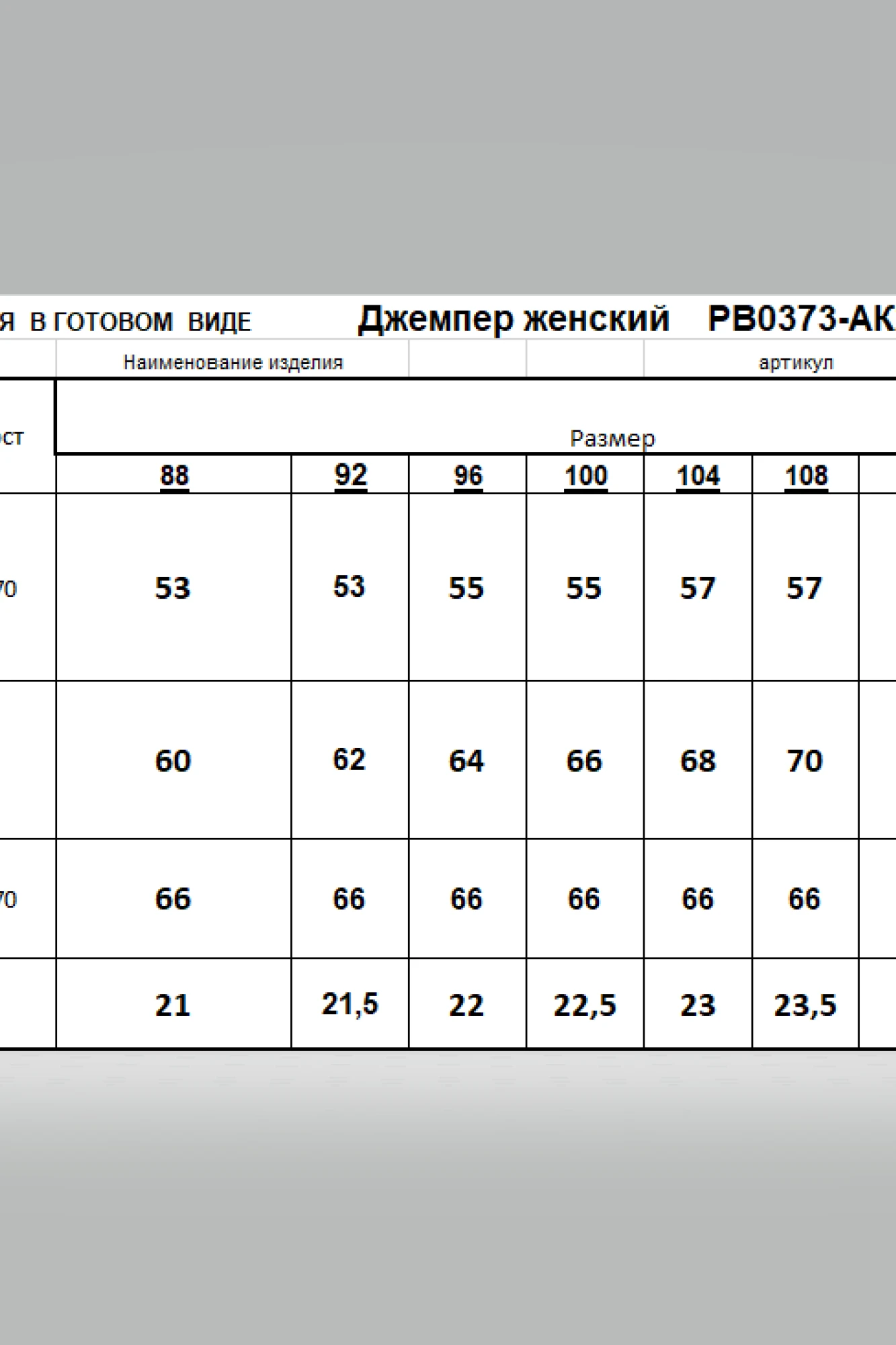 Таблица размеров