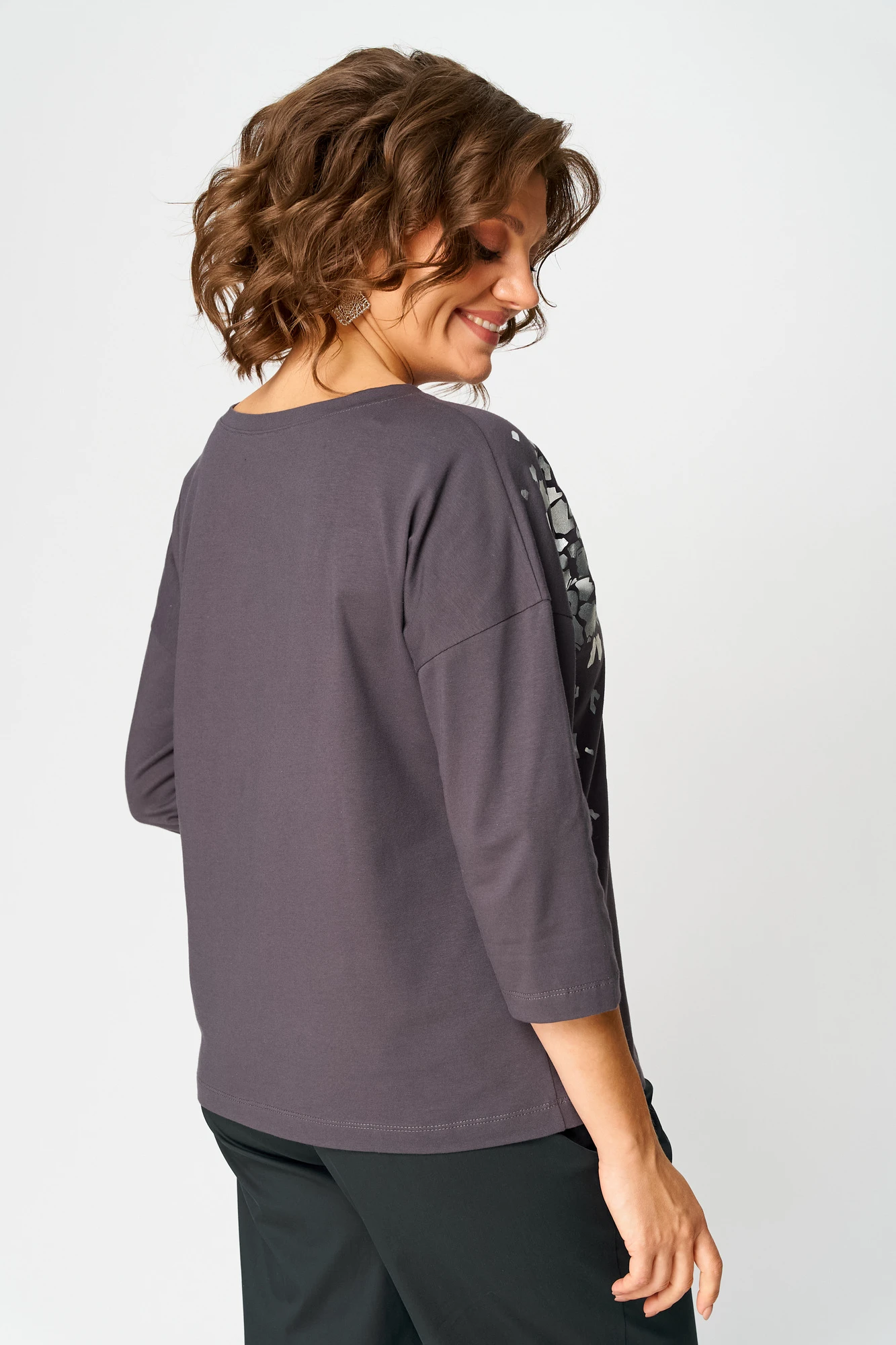 Джемпер женский из трикотажной ткани. По переду расположен принт. Спущенное плечо, рукав 3/4. Вырез горловины круглый, оформлен притачной бейкой.