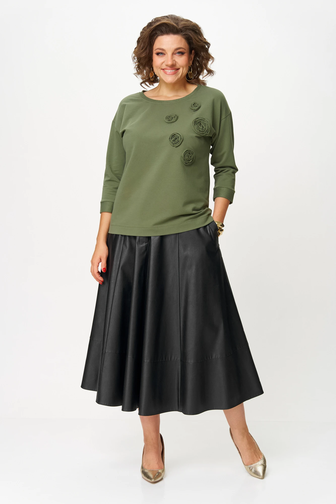 Джемпер женский из трикотажной хлопковой ткани (двунитка). По переду джемпера расположены декоративные элементы. Спущенное плечо, рукав 3/4. Низ рукава обработан манжетой. Вырез горловины круглый, оформлен бейкой.