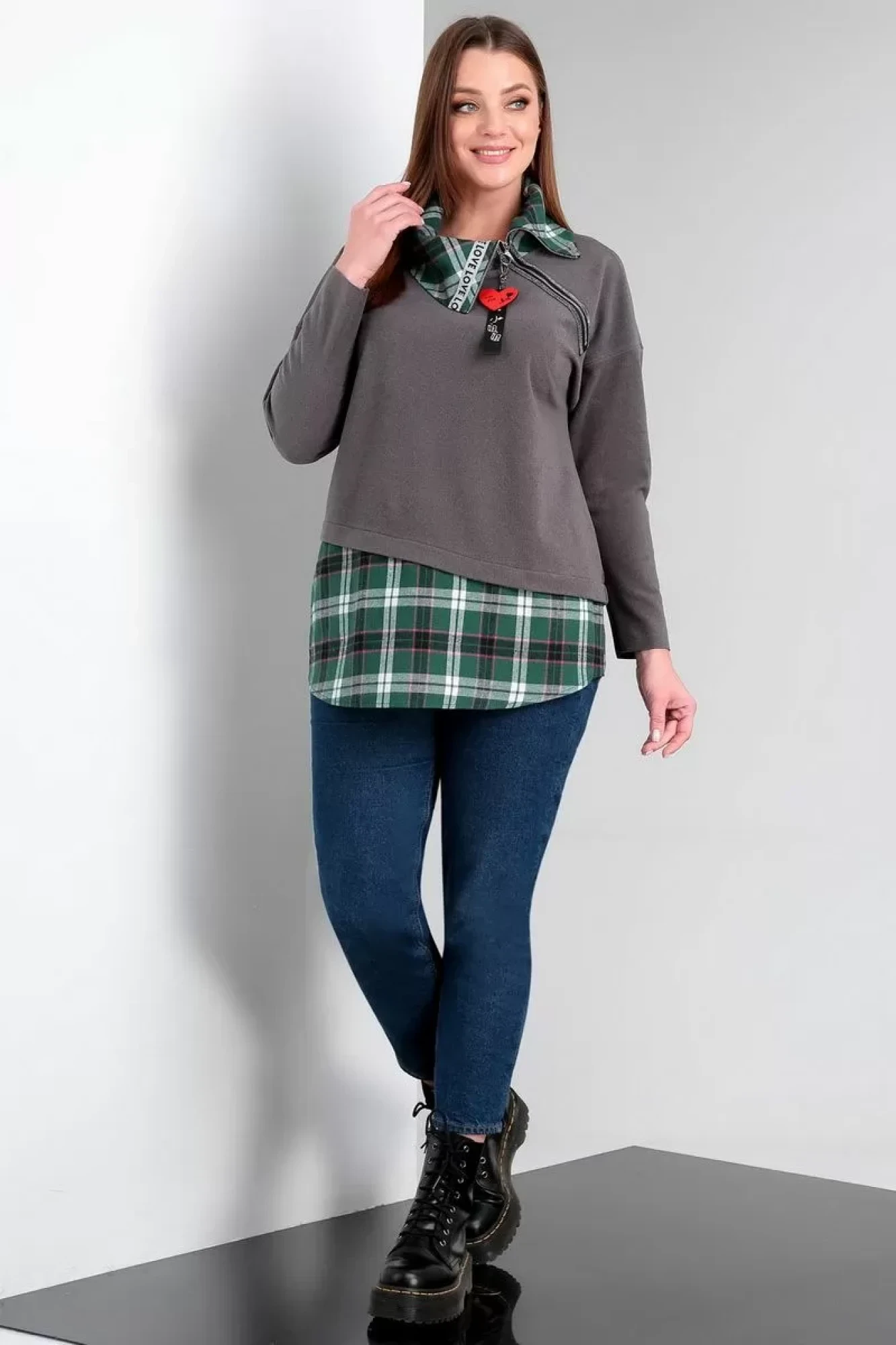 В целом изделие смотрится 2в1, как многослойный образ, т.е. словно поверх рубашки в клетку надета трикотажная кофта.