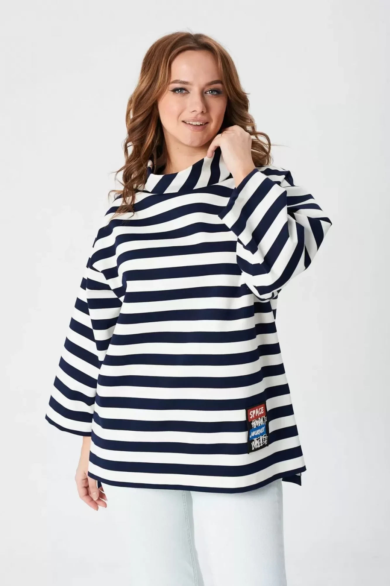 Джемпер женский, свободного силуэта. Горловина стойка с отворотом. Рукав со спущенной линией плеча. По переду декоративная нашивка.