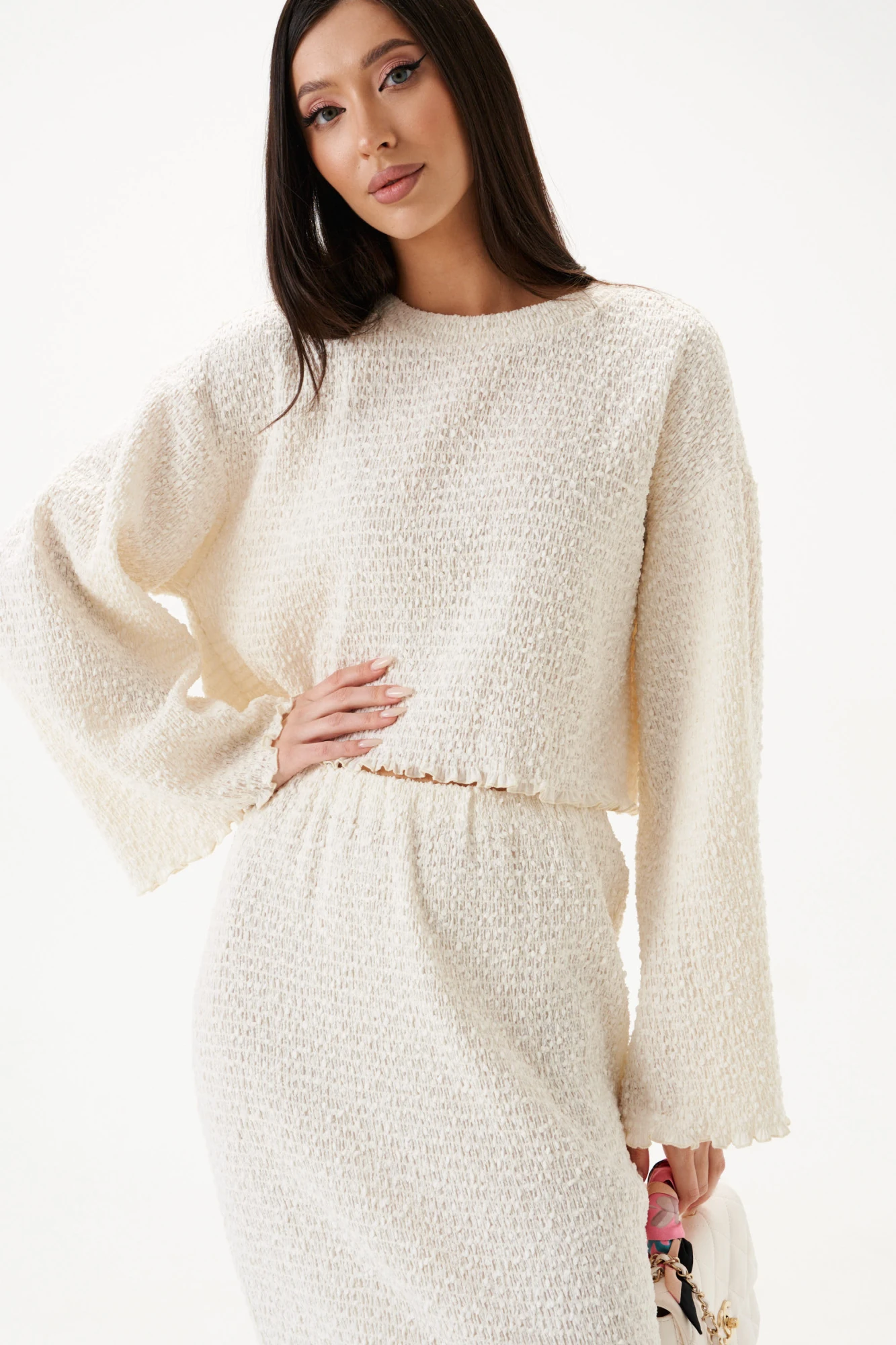 Джемпер свободного кроя. Выполнен из теккстильной ткани «букле-венгерка». Круглый вырез горловины. Рукав втачной, немного спущен. Длина рукава 50 см. Длина спинки 40 см