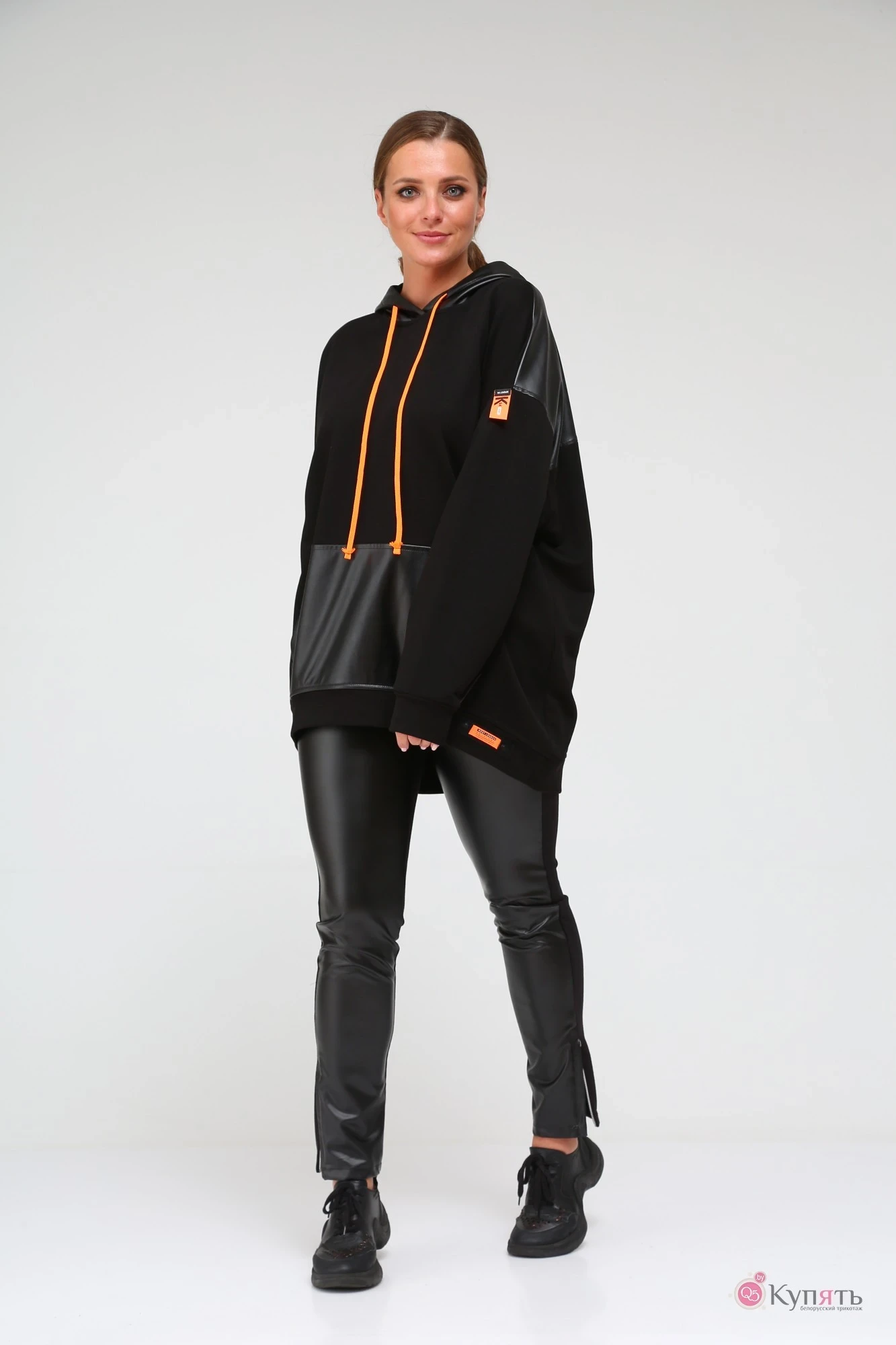 Худи со спущенной линией плеча, свободного силуэта, с элементами из экокожи. С двойным капюшоном, по переду карман по типу “кенгуру”. Низ изделия и манжеты рукава выполнены из основного полотна.