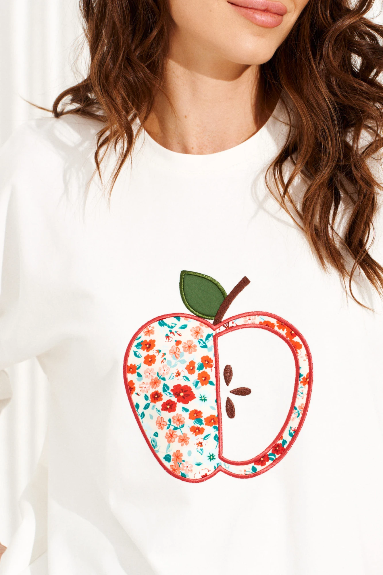 Джемпер из трикотажного полотна свободного объема, прямого силуэта, с круглым вырезом горловины. Вырез горловины обработан притачной обтачкой. Перед и спинка цельные. По переду выполнена вышивка-аппликация «Яблоко». Рукав втачной, одношовный, короткий. Длина изделия на модели вдоль середины спинки — 68,5 см (допустимое отклонение +/- 1 см)
