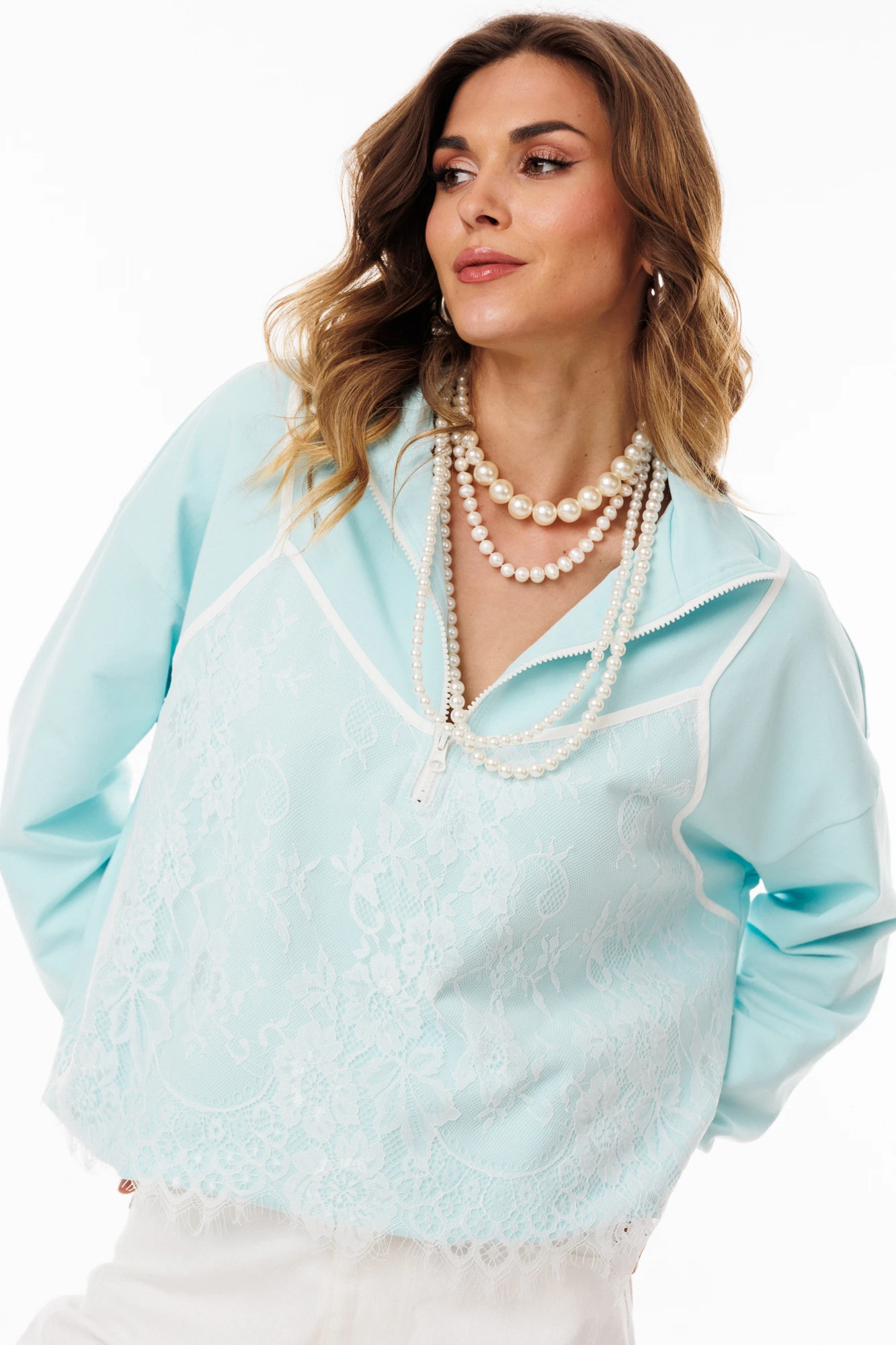 Джемпер выполнен из трикотажного полотна. Джемпер прямого силуэта, покроя oversize. Длиной до линии бедер. По переду обработана застёжка на тракторную молнию от линии груди до верха. Горловина округлой формы, обработана воротником стойкой. Плечевой шов удлинен. Рукав рубашечного покроя, одношовный. Низ рукава обработан притачной манжетой. По низу джемпера обработана эластичная тесьма с фиксаторами. Джемпер декорирован по переду кружевом, имитирующим перед топа на бретелях.