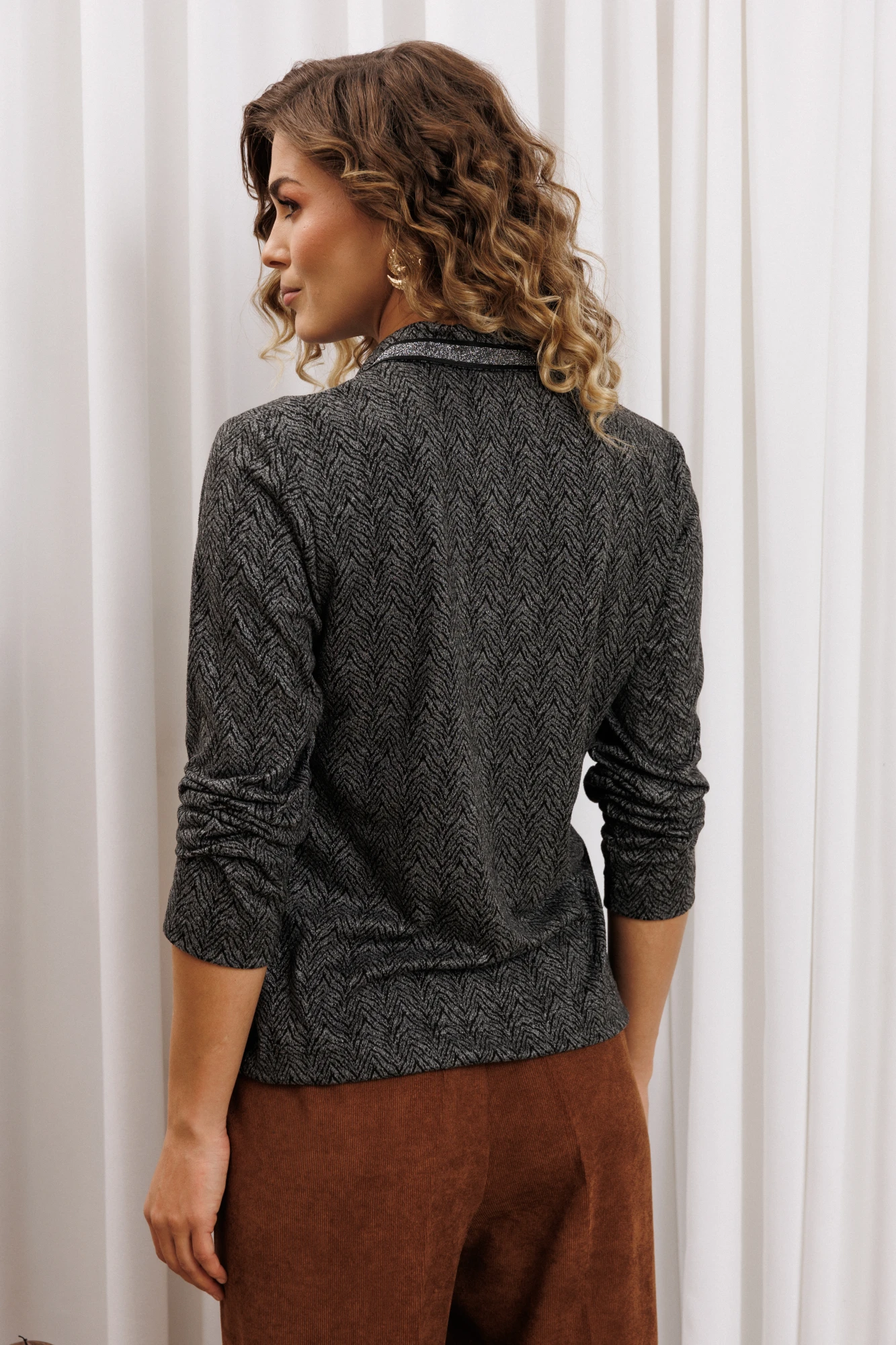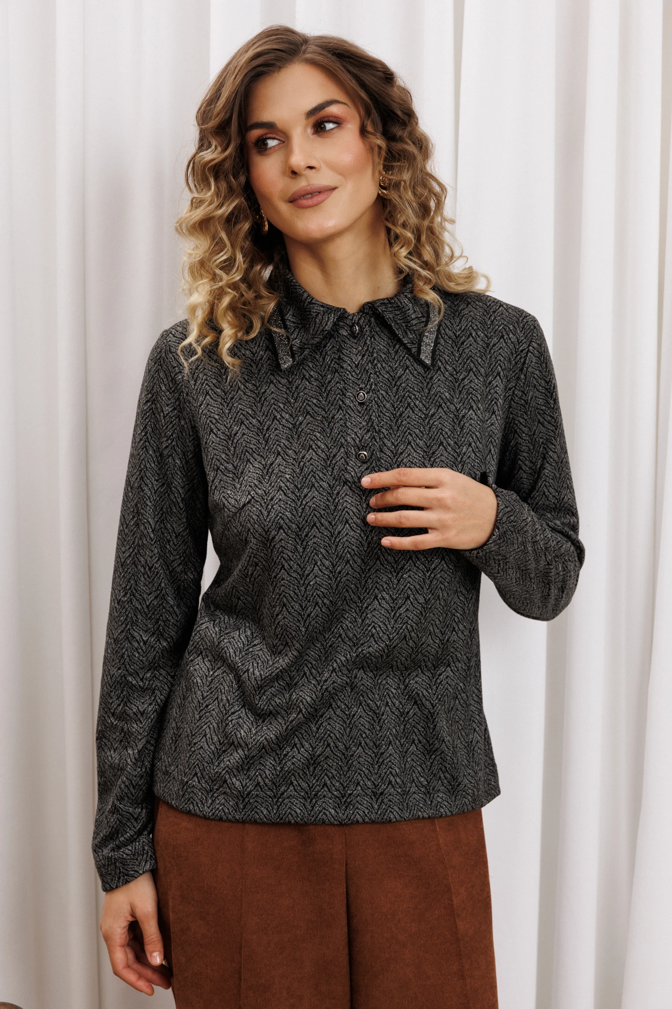 Джемпер прямого силуэта из плотного трикотажного полотна с оригинальным рисунком из люрекса. Перед с застежкой поло и нагрудными вытачками. По воротнику настрочена декоративная тесьма. Длина джемпера - 60 см, длина рукава - 61 см.