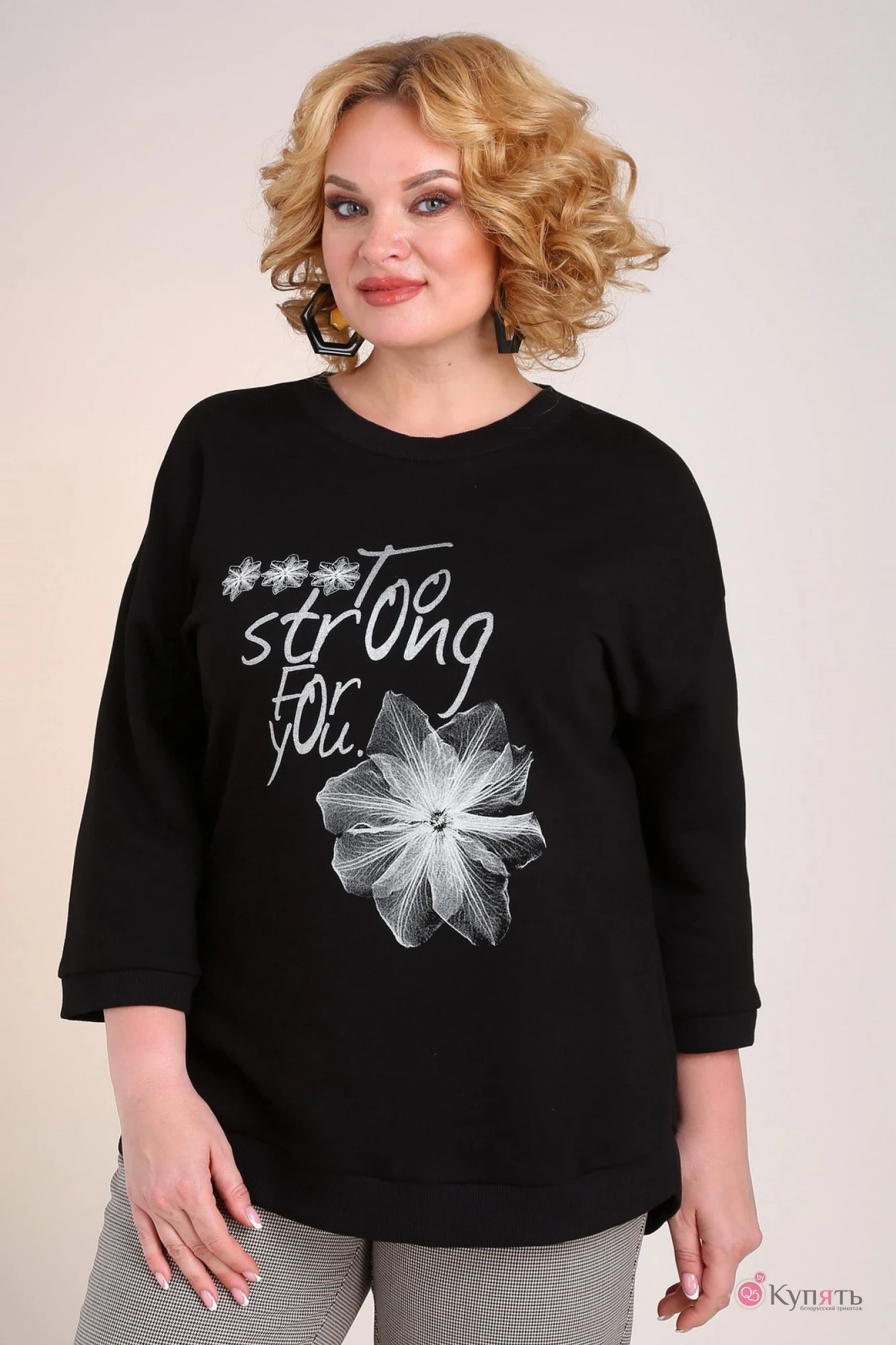 Блуза женская свободного силуэта изготовлен из хлопчатобумажного трикотажного полотна. Горловина круглой формы обработана довязом. Рукав спущенный, длина 3/4, по низу манжета из довяза. Низ изделия фигурной формы обработан планкой из довяза. Блуза дополнена печатью по переду и спинке.