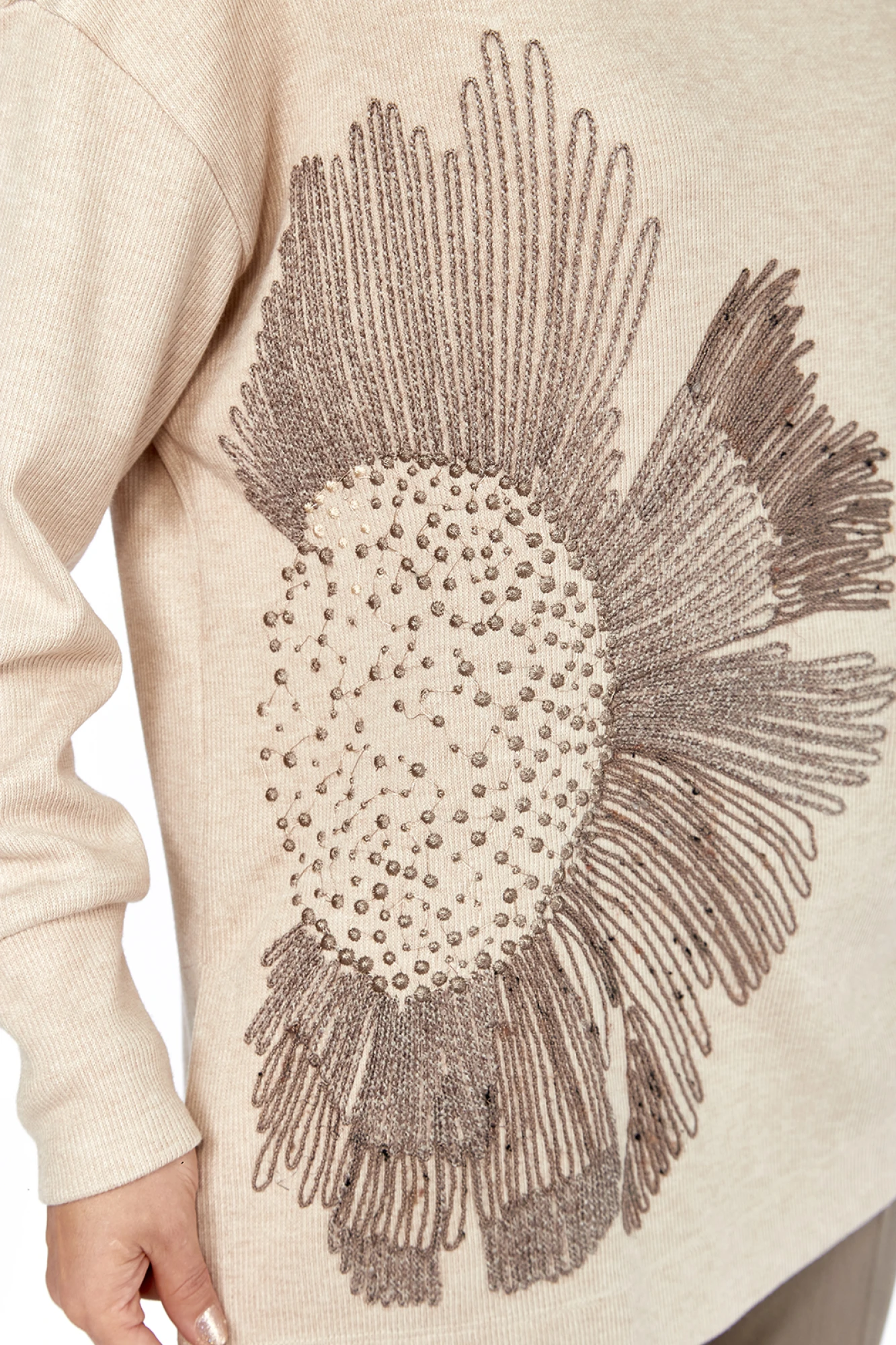 Джемпер женский, свободного кроя, изготовлен из трикотажного полотна. Горловина круглой формы. На полочке — вышивка. Спинка цельнокроенная. Рукава спущеные, с манжетам по низу. В боковых швах разрезы.