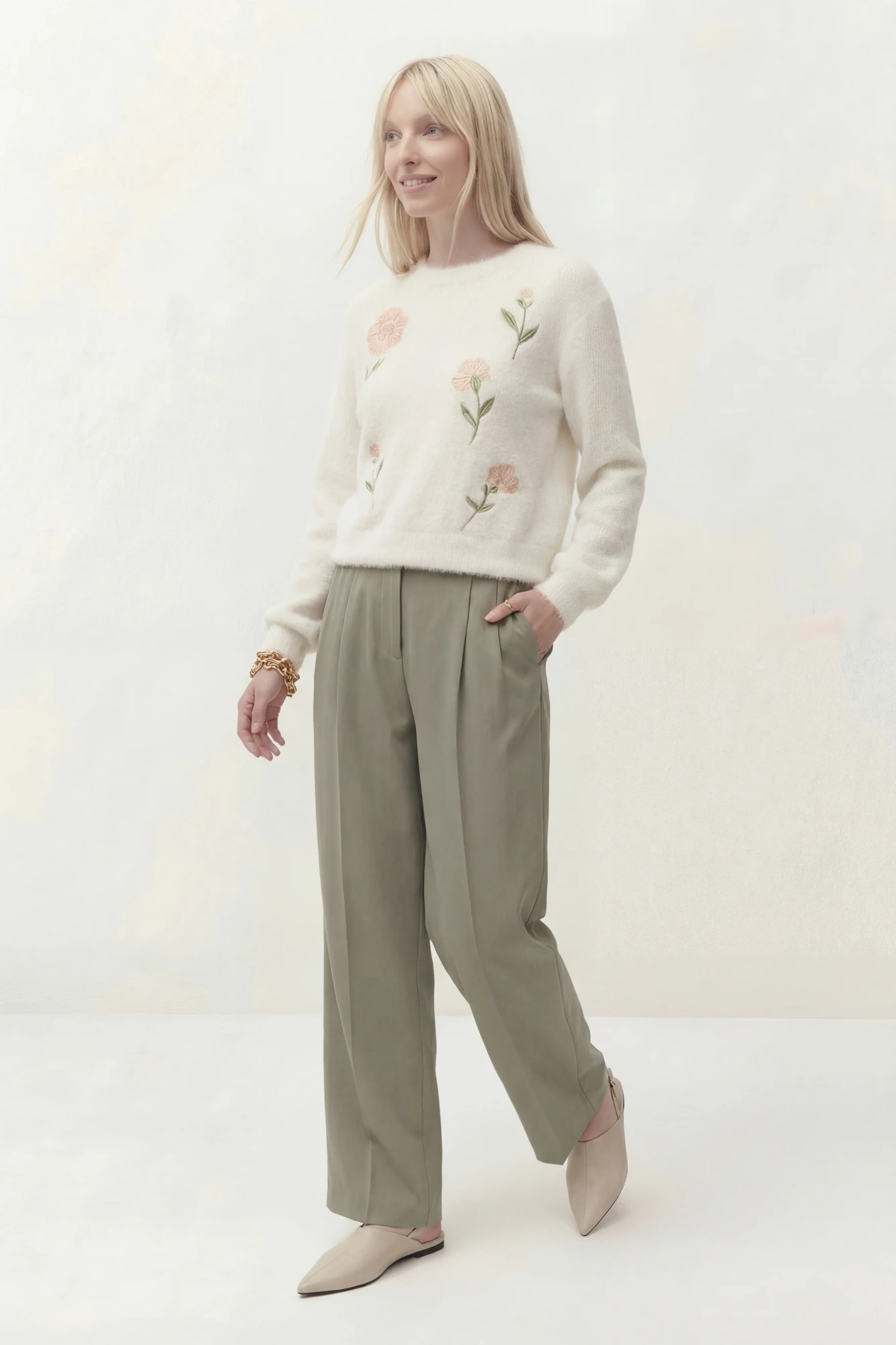 Джемпер свободного кроя, линия плеча спущена. По низу рукава манжета. Округлый вырез горловины с притачной бейкой, по низу джемперы притачная планка. По переду выполнена вышивка.