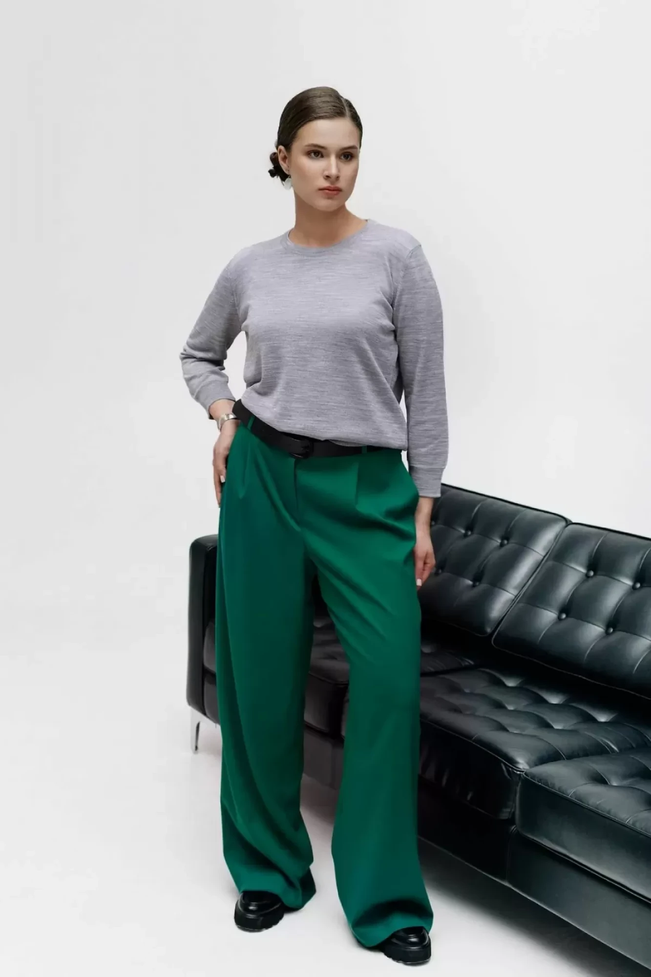 Джемпер женский второго слоя одежды. С втачным рукавом длиной 3/4. Круглый вырез горловины обработан бейкой сдвоенная кулирная гладь высотой в готовом виде 1,8 ± 0,2 см.. Низ станов и рукавов заработан ластиком 1х1 высотой в готовом виде 5,5 ± 0,5 см. -стан; 6,0 ± 0,5 см -рукав. По краю бейки и низу рукава проложена высокорастяжимая полушерстяная пряжа "Новинка" 110 Текс.