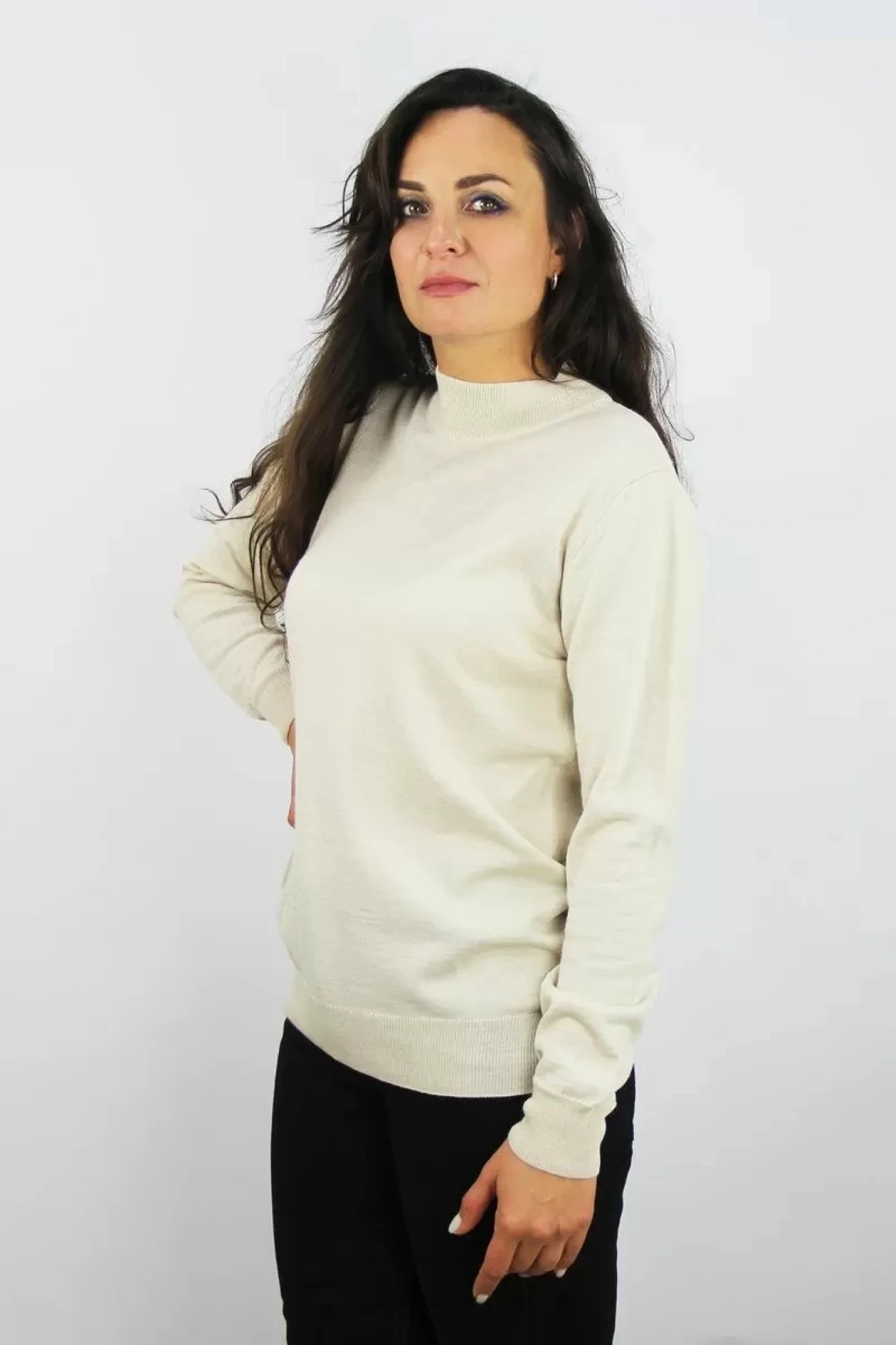 Cвитер прямого силуэта с длинным втачным рукавом.Круглый вырез горловины обработан двойныым ластичным воротником-стойкой (полукеттлёвка) выс.в гот.виде 5,5+-0,2см