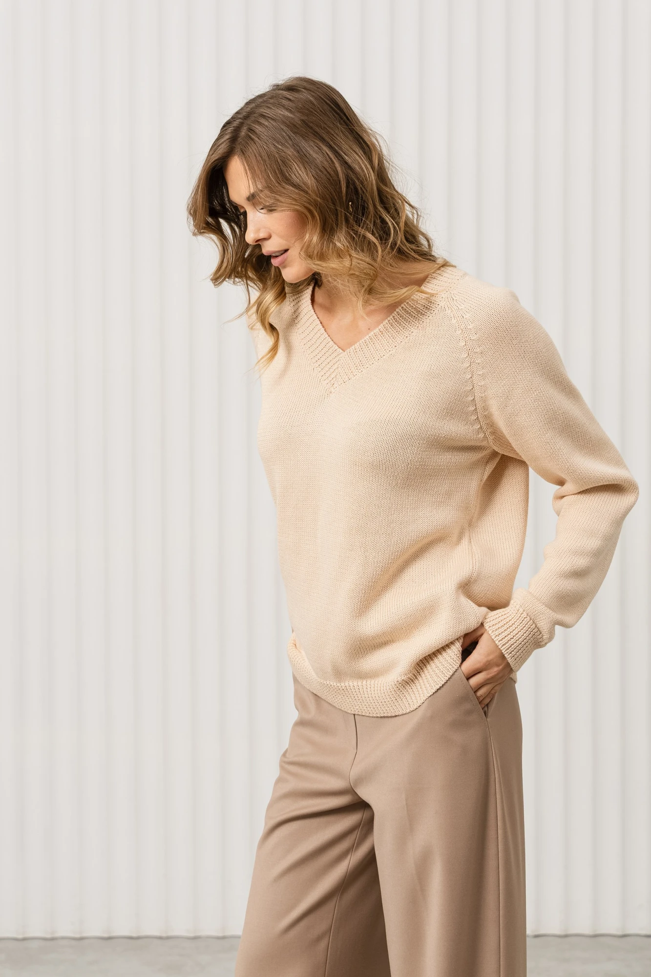 Джемпер отлично сочетается с брюками классического кроя, как на фото, джинсами или юбками. Для завершения образа подойдут балетки, лодочки или туфли на низком каблуке. Дополните образ минималистичными аксессуарами, такими как тонкий браслет или серьги.