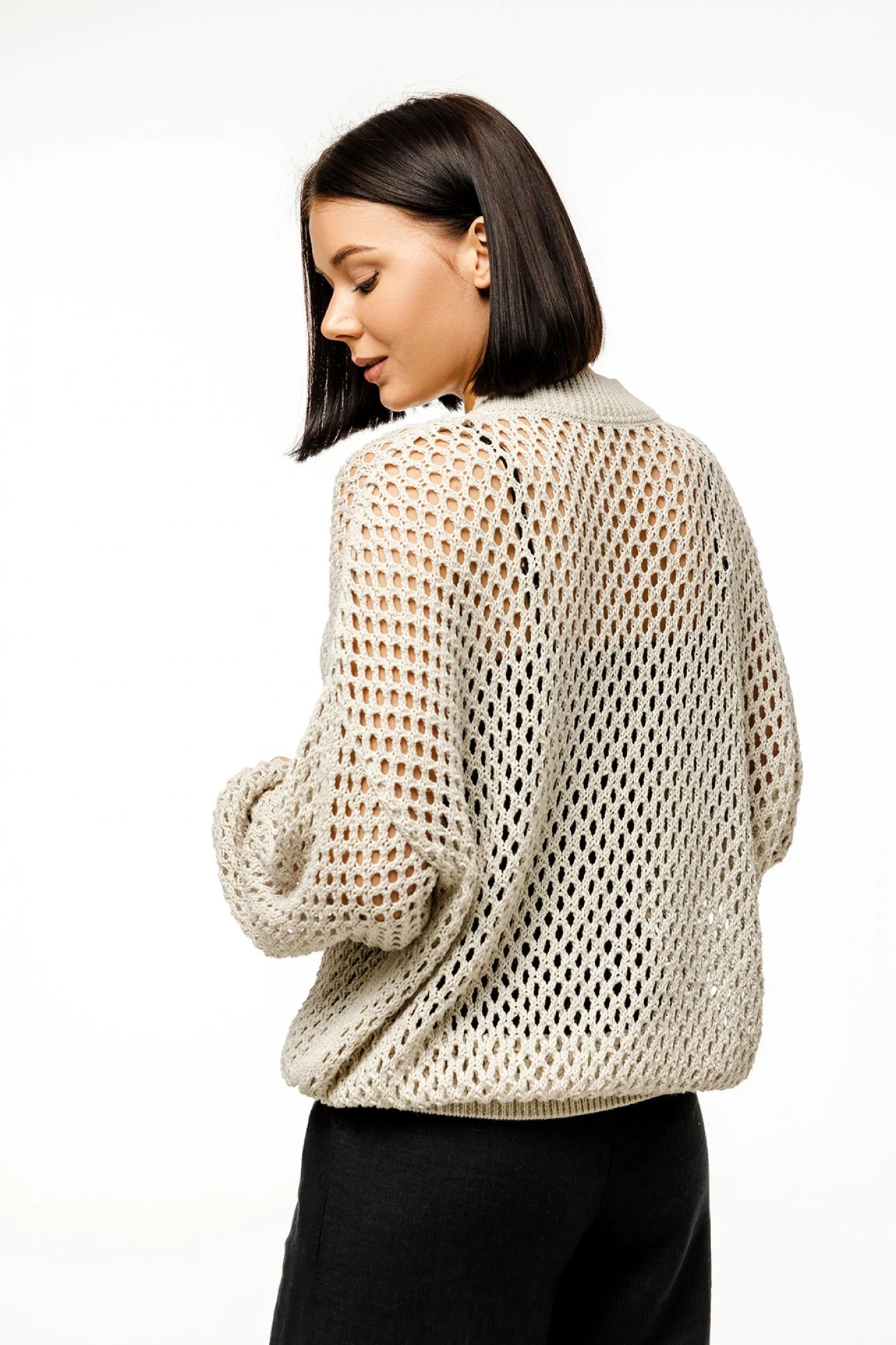 Джемпер прямого силуэта со спущенной линией плеча, с рубашечным длинным рукавом. Форма горловины V - образная ,обработана накеттлеванной бейкой. Перед, спинка, рукава выполнены ажурным переплетением. Низ изделия и рукавов, связаны переплетением- ластик. Джемпер изготовлен из пряжи, в составе которой хлопок 40%, П/Э 40%, лен 20%.