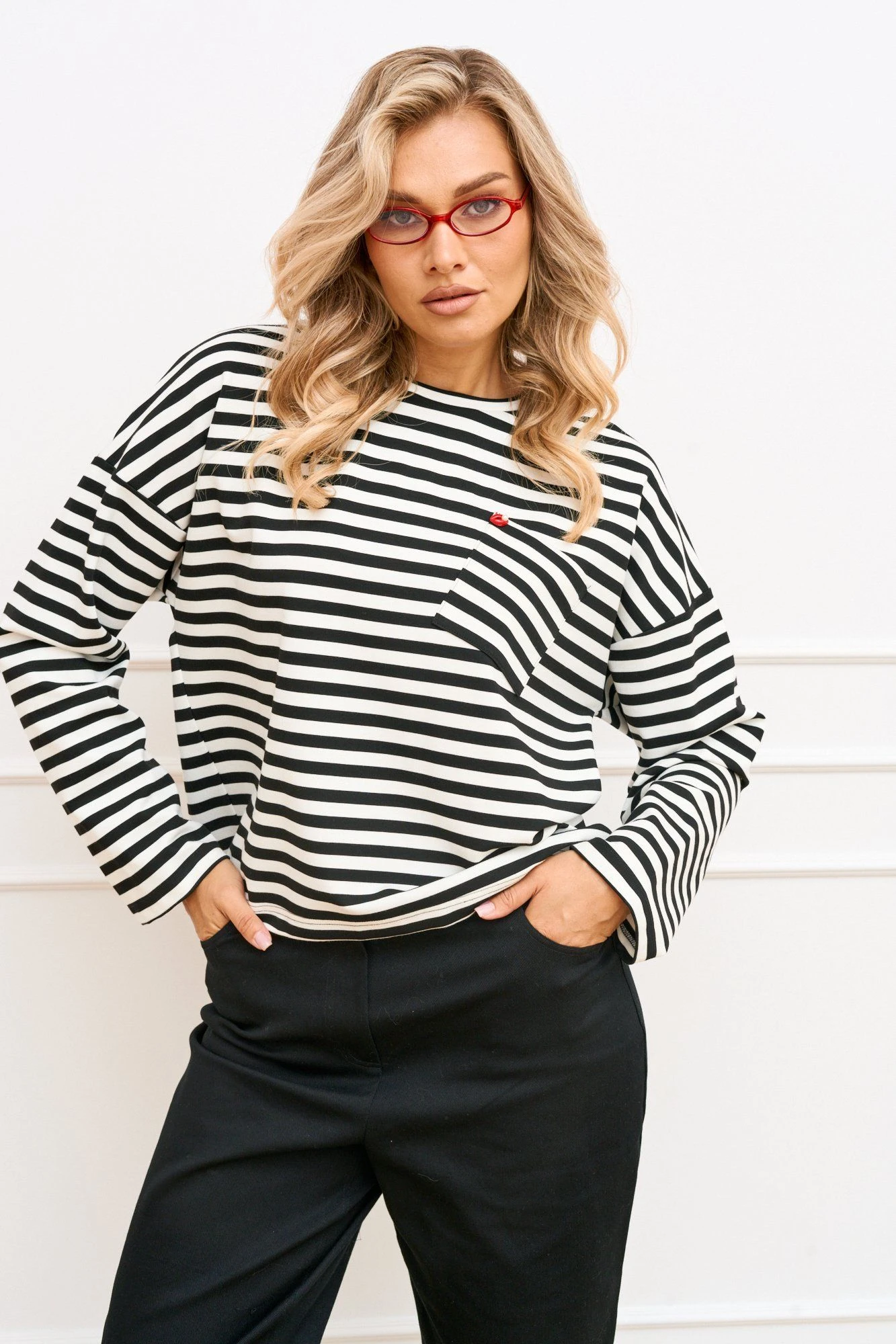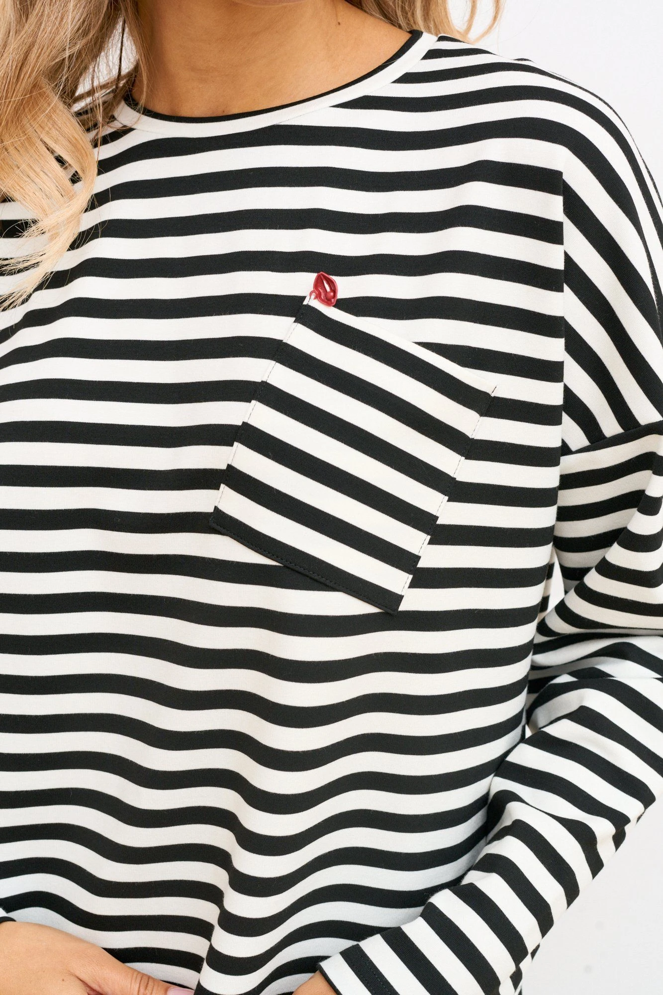 Джемпер свободного силуэта из трикотажного полотна в полоску длиной ниже линии бедер. Линия плеча спущена, рукав длинный втачной одношовный. Вырез горловины круглый обработан притачной бейкой. По полочке с левой стороны обработан накладной карман. Низ изделия асимметричный по спинка длиннее относительно переда.
