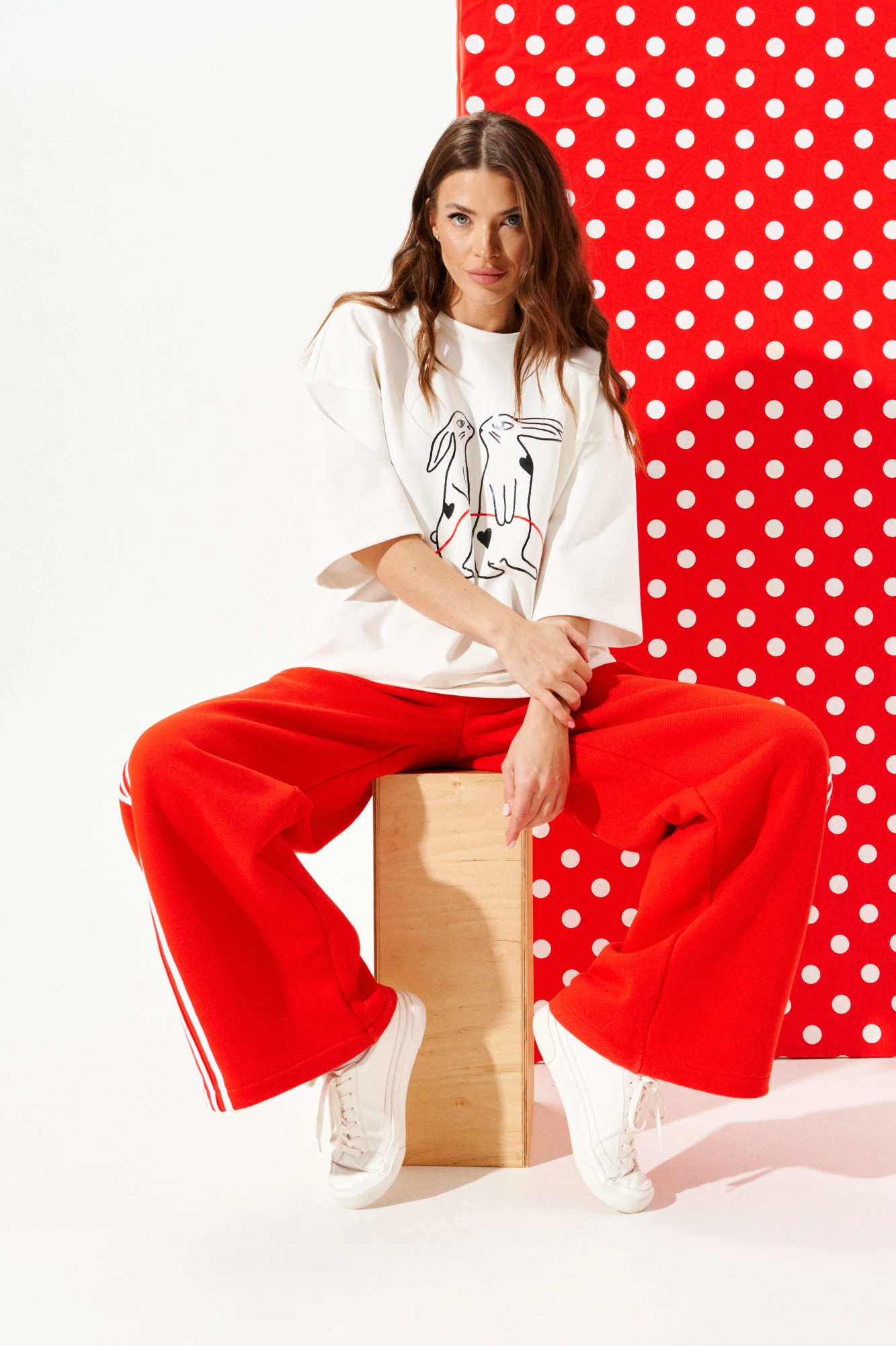 Джемпер из трикотажного полотна свободного объема, прямого силуэта, с круглым вырезом горловины.Перед и спинка цельные. По переду выполнена печать «Зайцы». Рукав втачной, одношовный, короткий.