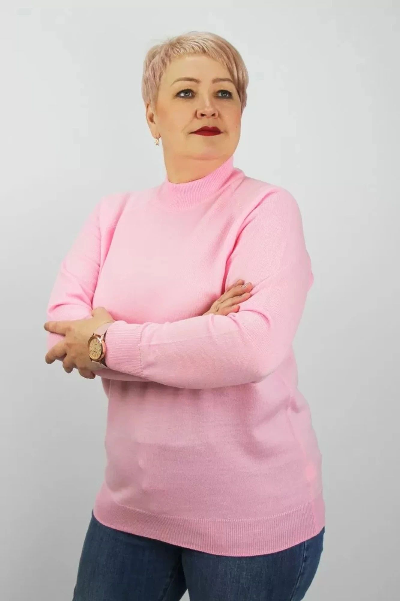 Свитерок лёгкий, больше напоминает водолазку. Но это не в упрёк. Весьма удобная вещь под пиджак. У меня только одно замечание - для 64 размера слегка тесный ворот, душит шею. Надеюсь разносится.
