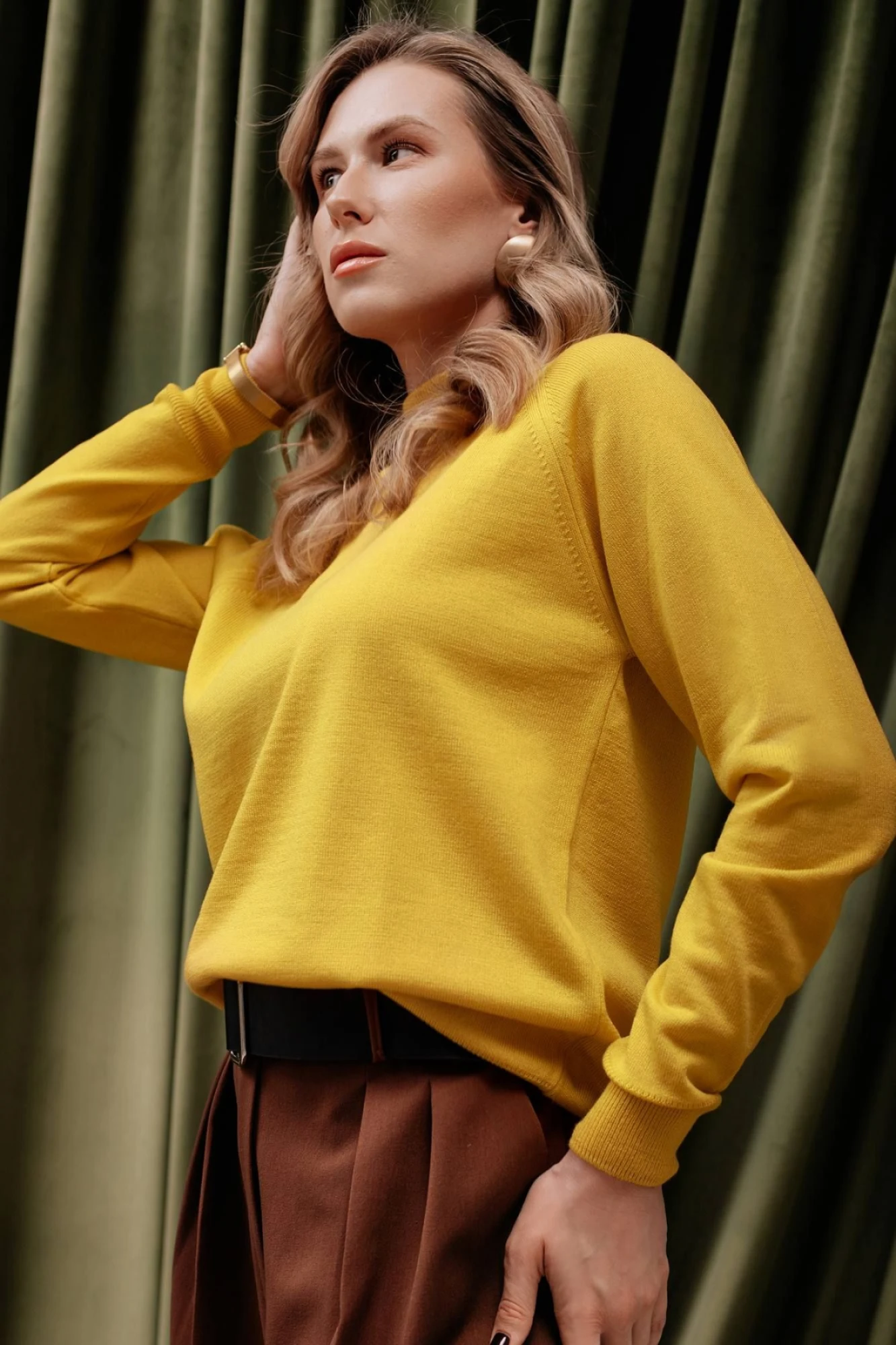 Свитер прямого силуэта с длинным рукаом "реглан". Низ изделия и рукавов заработан ластиком 1х1, высотой в готовом виде 6,0см+-0,5см(станы),6,5+-0,5см (рукава). Воротник - двойная ластичная стойка 5,5см+-0,5см в готовом виде, полукеттлевка. По краю низа рукава проложена пряжа полушерстянная высокорастяжимаю "Новинка" 132т.