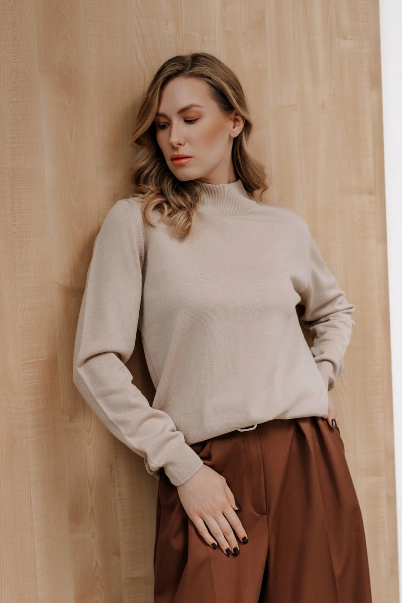 Свитер женский ,второго слоя одежды, с длинным втачным рукавом. Низ изделия и рукавов заработан ластиком 1х1, высотой в готовом виде 4,5см+-0,5см(станы),5,0+-0,5см (рукава). Воротник - двойная ластичная стойка 6,0см+-0,5см в готовом виде, полукеттлевка. По краю низа рукава проложена пряжа полушерстянная высокорастяжимая "Новинка" 110т