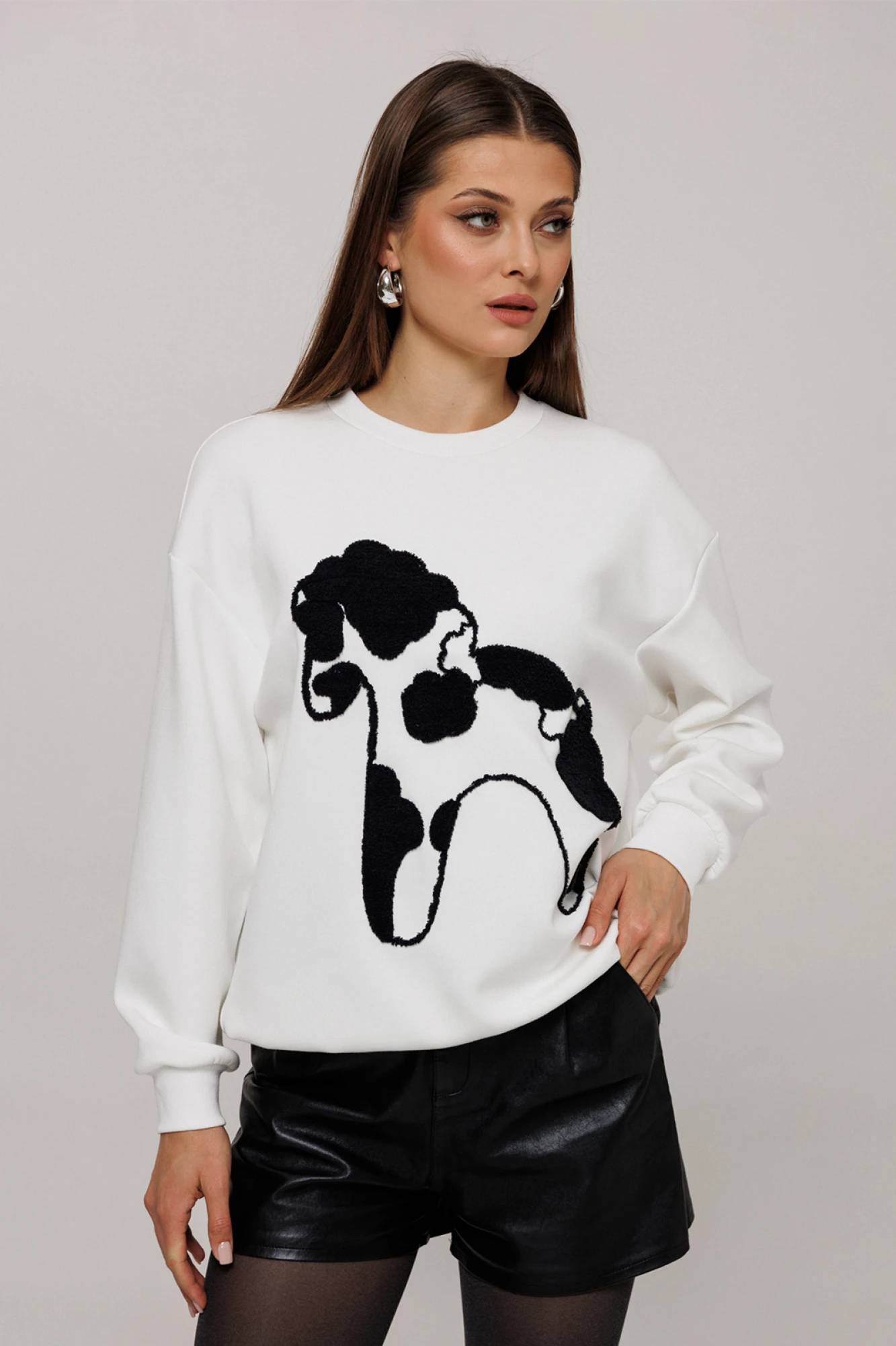 Джемпер из технологичного трикотажного полотна с эффектом peach. Прямого силуэта с втачным рукавом и спущенной линией плеча, с манжетой из отделочной ткани по низу рукава. По переду вышивка "Лошадка". По горловине и низу изделия притачная планка из отделочной ткани.