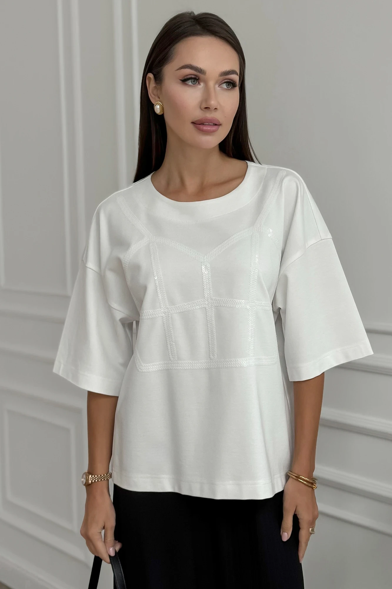 Джемпер женский, прямого силуэта. Перед цельнокроеный, декорирован авторской вышивкой пайетками. Спинка цельнокроеная. Плечо спущено. Рукав притачной с манжетой длиной ниже локтя. Горловина округлой формы, обработана обтачкой, отстрочена. Декоративные элементы и фурнитура могут отличаться от заявленных на фото. Цвет материала может отличаться по тону в зависимости от настроек вашего монитора!
