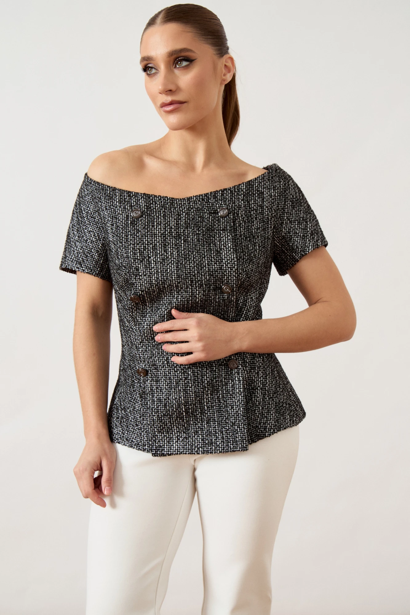 Топ полуприлегающего силуэта выполнена из фактурной костюмной ткани с переплетением нитей разных оттенков, на подкладке. Вырез горловины широкий, открывающий плечи (тип «анжелика»), обработан внутренней обтачкой. Полочка с центральным швом и двубортной имитацией застежки на шесть декоративных пуговиц. Рукав втачной, короткий, без дополнительных деталей.