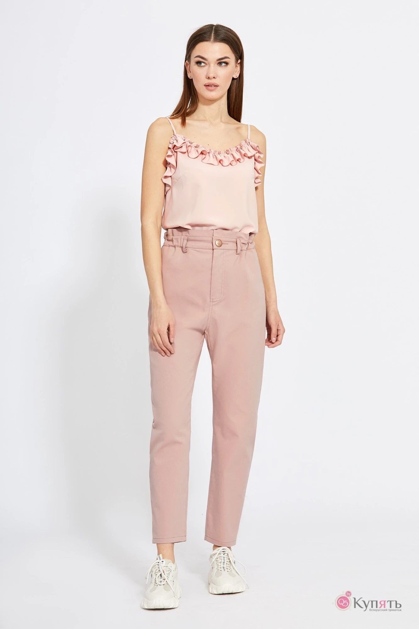 Топ выполнен из однотонного крепа. Топ прямого силуэта, длиной выше линии бедер. Перед и спинка цельные. Горловина переда и спинки обработана окантовкой. Верх топа по переду и спинке декорирован рюшем. Топ на регулируемых бретелях.