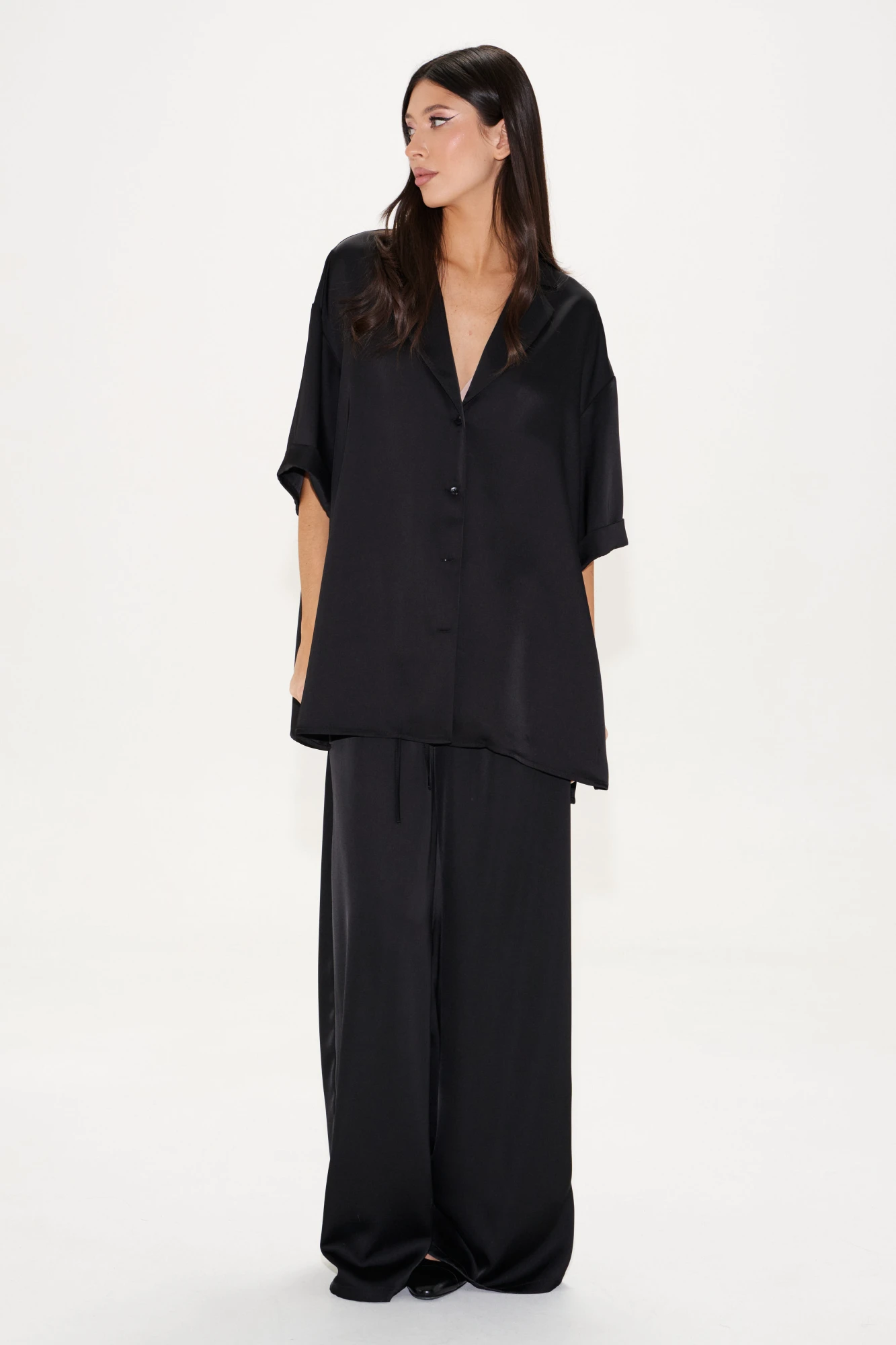 Блузка прямого свободного кроя выполнена из текстильной ткани чёрного цвета. Характеристики: отложной воротник, застежка центральная на петли пуговицы, спущенная линия плеча, по бокам изделия разрезы 31см, рукав кароткий прямого кроя. Длина рубашки 75 см, длина рукава от края горловины 44см.