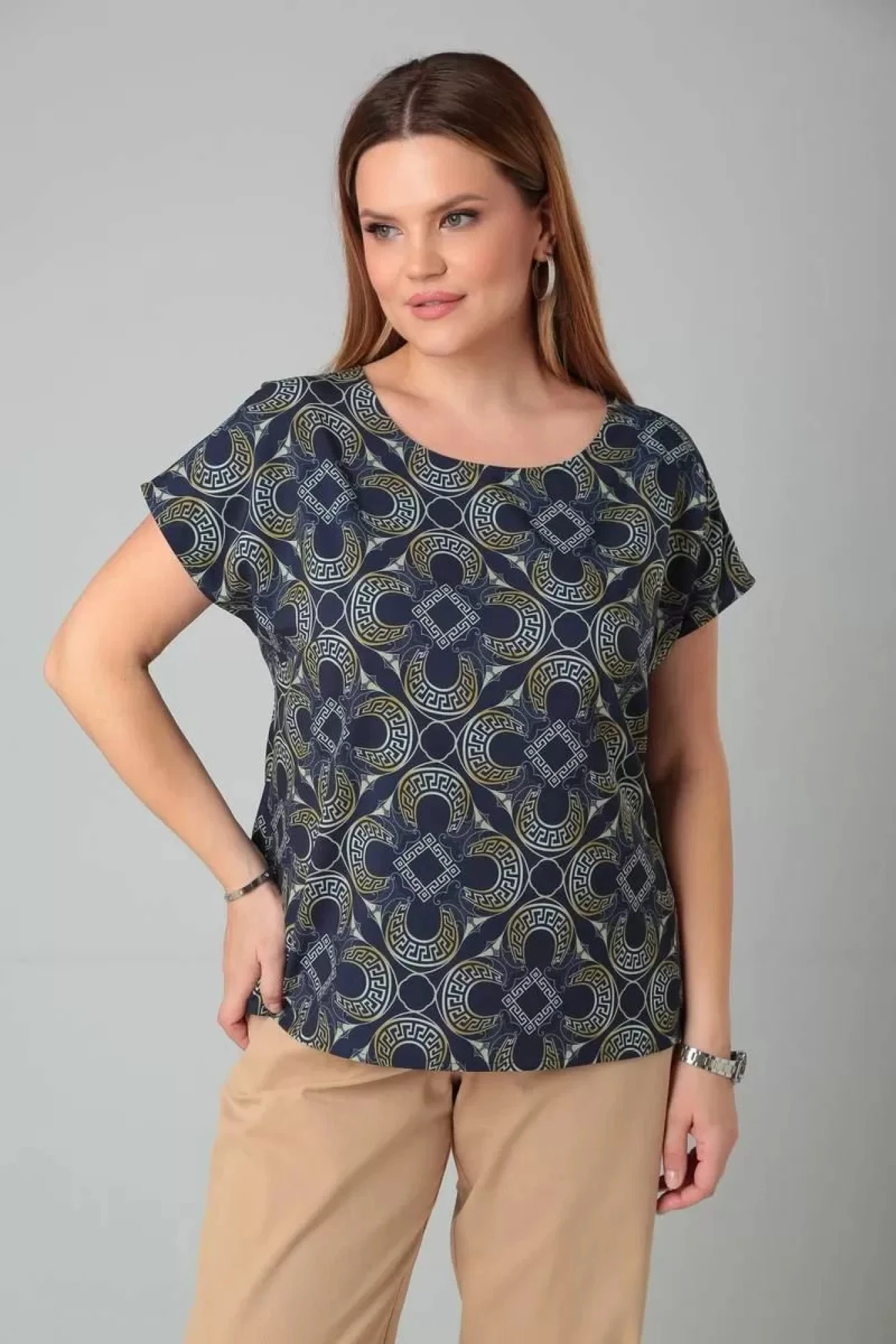 Блузка женская прямого силуэта, со спущенной линией плеча, с округлым вырезом горловины. Модель представлена в принтованых благородных расцветках. Блузка женская больших размеров станет настоящей находкой для повседневных комплектов в офис, на работу, для прогулок и торжеств.