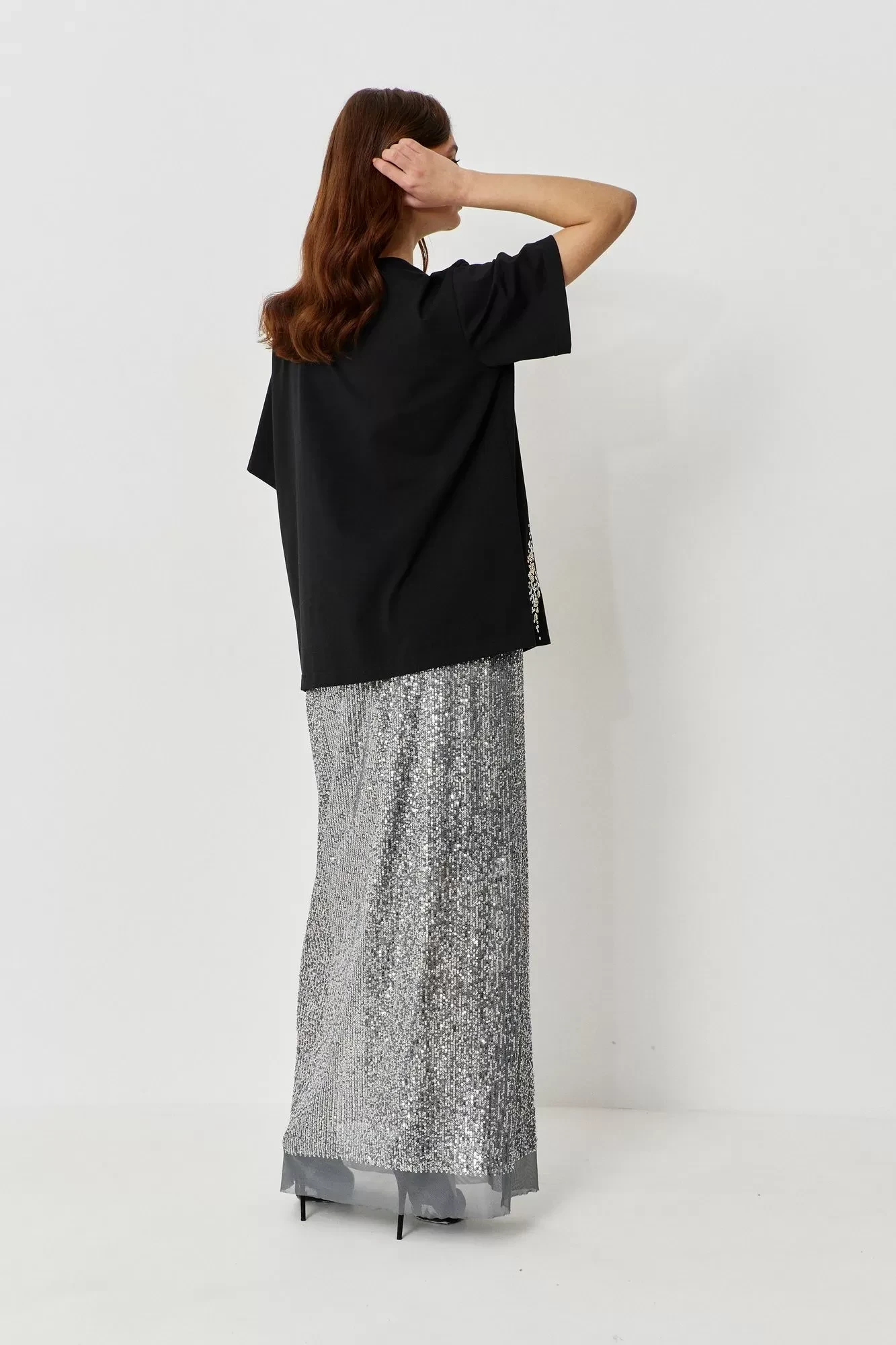 Джемпер свободного силуэта с вышивкой. Характеристики: выполнен из трикотажного полотна в черном цвете, по переду декоративный элемент в виде вышивки пайетками, рукав укороченный.