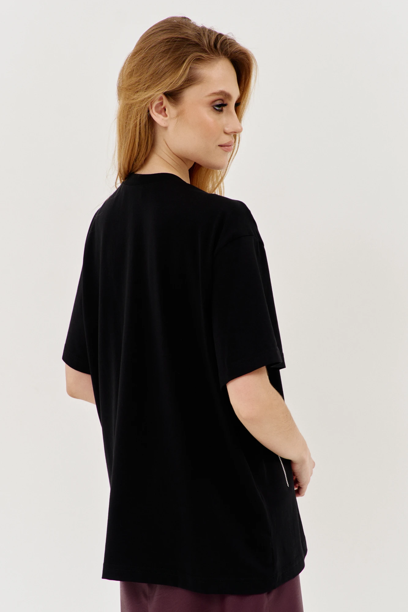 Майка свободного силуэта со спущенным рукавом. Характеристики: выполнена из трикотажного полотна в черном цвете, по горловине переда металлические цепи-украшения, горловина обработана планкой, рукав укороченный.