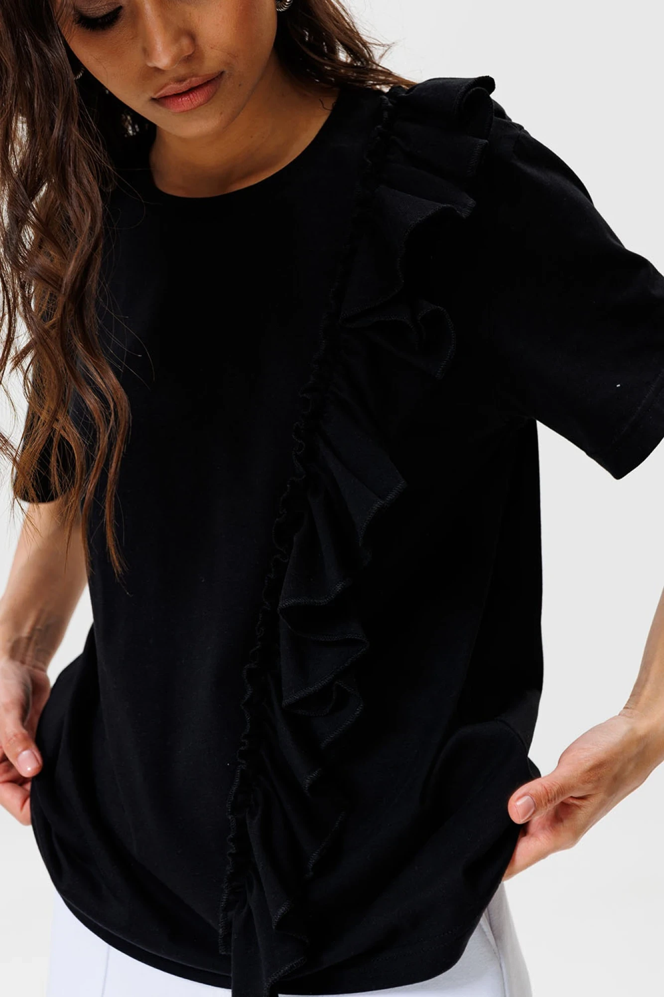 В этой футболке с воланом от GOwear вы не останетесь незамеченной! Вы легко сможете собрать много стильных образов с вашими юбками, шортами, жакетами и брюками!