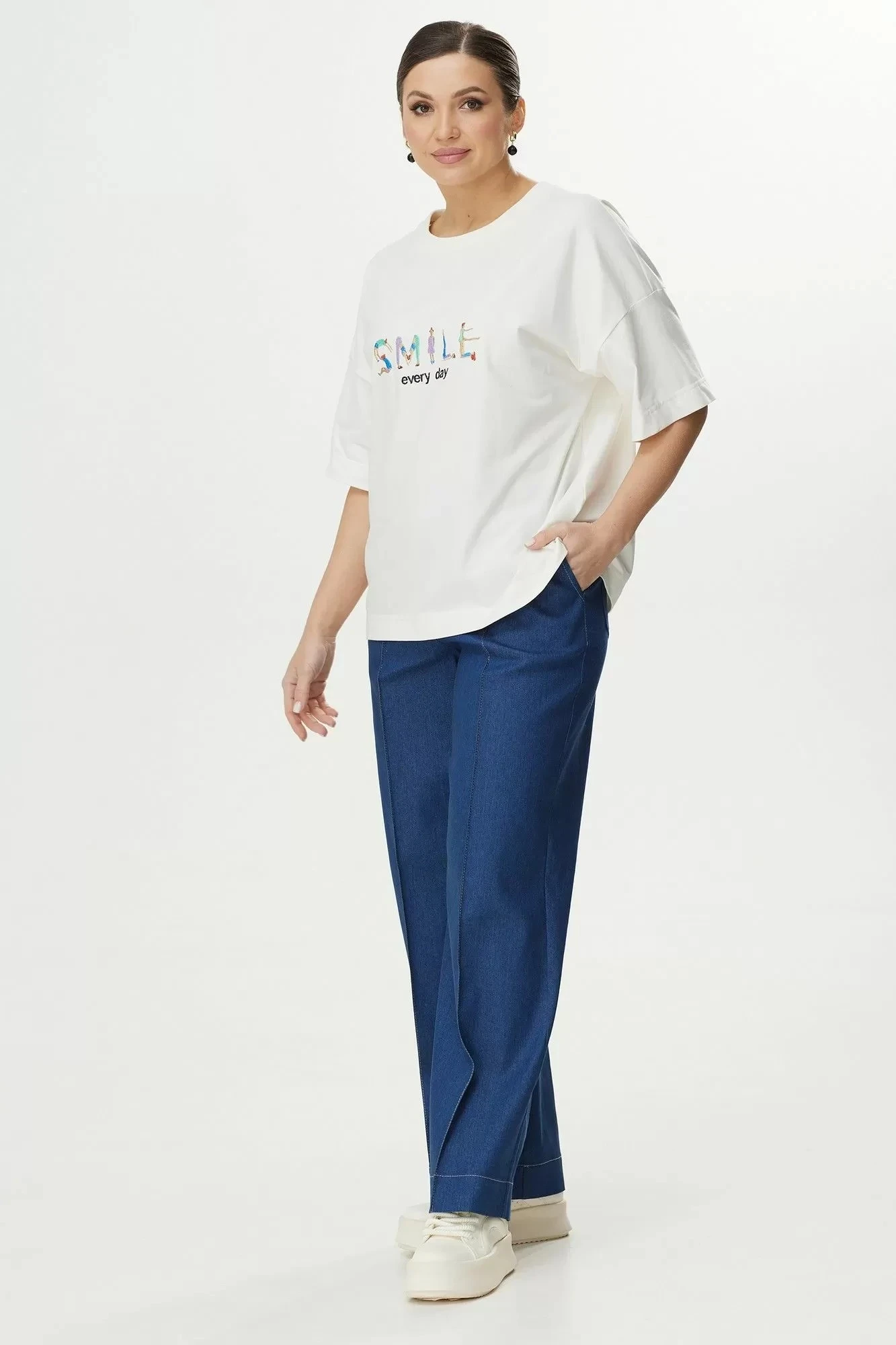 Джемпер женский из трикотажного полотна, прямого силуэта. Перед декорирован авторской вышивкой. Плечо спущено. Рукав притачной, одношовный. Горловина округлой формы, обработана обтачкой из кашкорсе. Декоративные элементы и фурнитура могут отличаться от заявленных на фото. Длина изделия от плеча 66 см, длина рукава от горловины 43 см.
