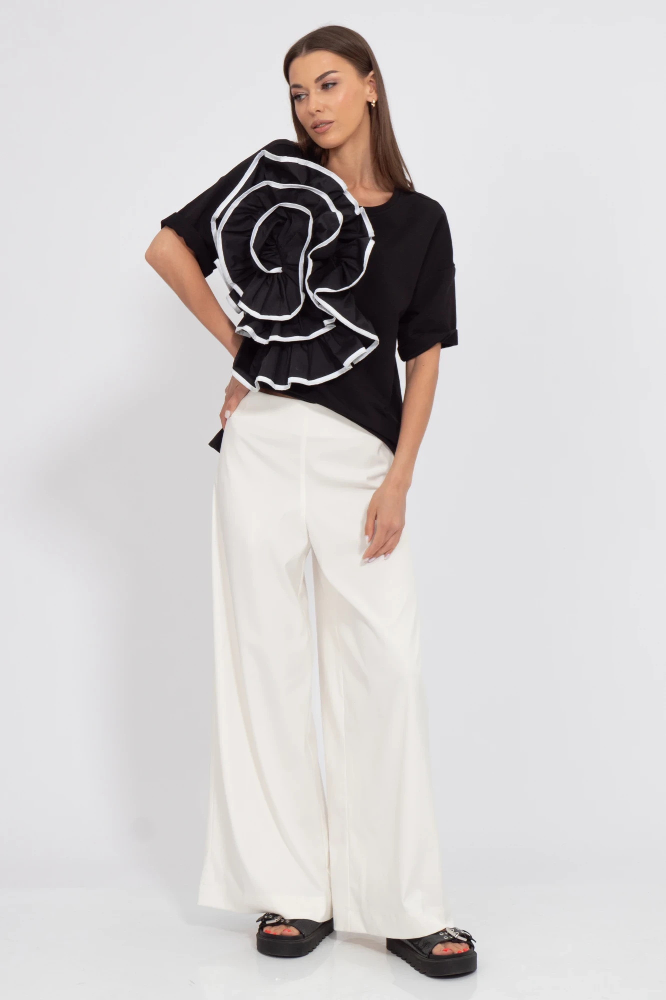 Джемпер из двухниточного футера с боковыми разрезами и объёмным декоративным цветком по переду — идеальный выбор для тех, кто ценит комфорт и стиль. Этот предмет одежды сочетает в себе элегантность и практичность, добавляя изюминку в ваш образ.
