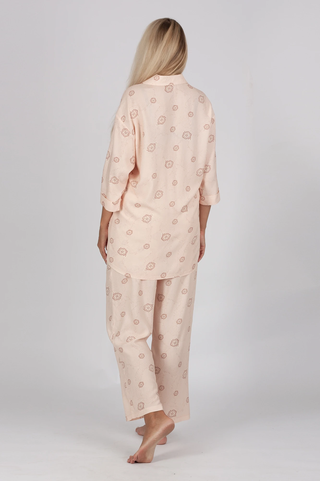 Комфортный комплект-пижама выполнена из шелковистого вискозного штапеля (текстиль), застежка на пуговицы, отложной воротник, длинный рукав. Брюки длинные, пояс на резинке, карманы. Рекомендована сухая утюжка изделия, без пара.