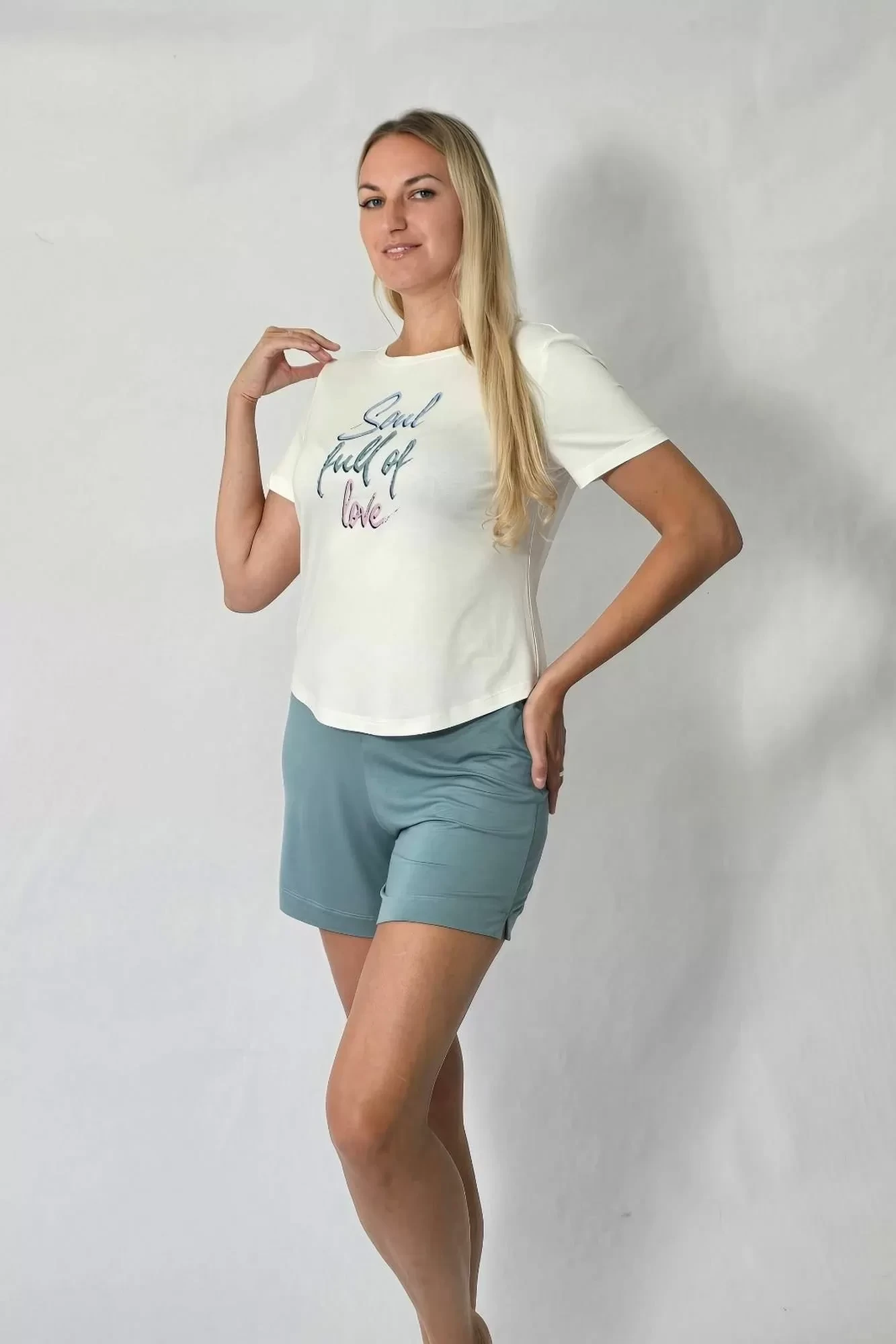 Комбинированный комплект состоит из шорт и футболки выполнен из вискозного трикотажного полотна. Футболка с коротким втачным рукавчиком, на груди - эффектная печать. Шорты выполнены из однотонного трикотажного вискозного полотна, пояс на резинке. Отличный комплект для сна и отдыха.