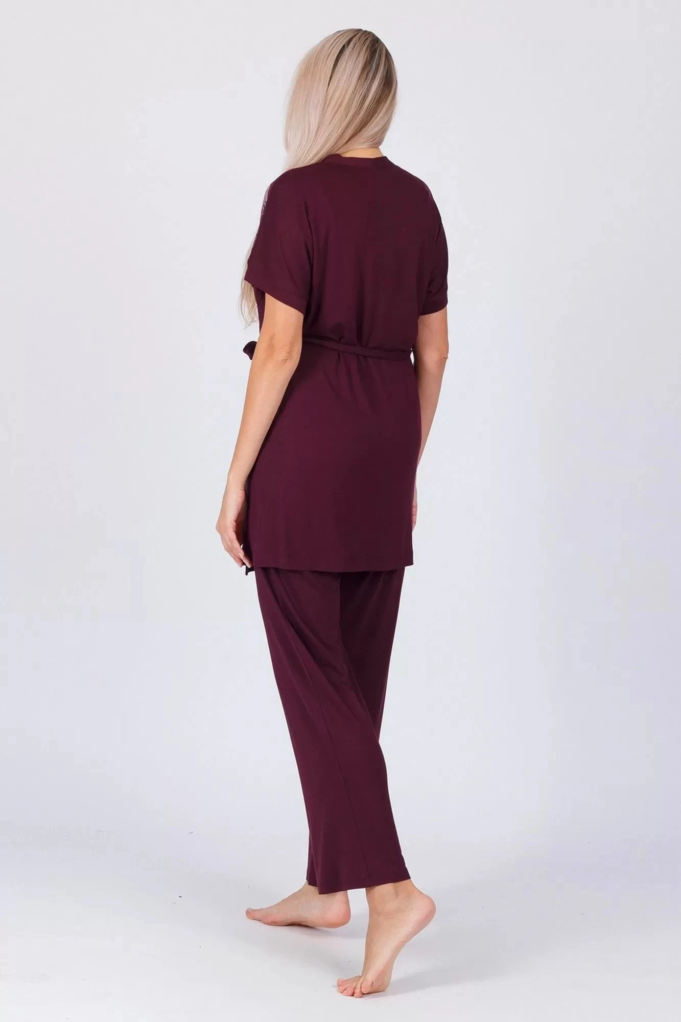 Роскошный комплект-тройка состоит из топа на бретелях с регуляторами, прямых брюк и короткого халатика на запах. Халатик и топ декорированы французским биколорным кружевом. На лифе топа украшение - страз.