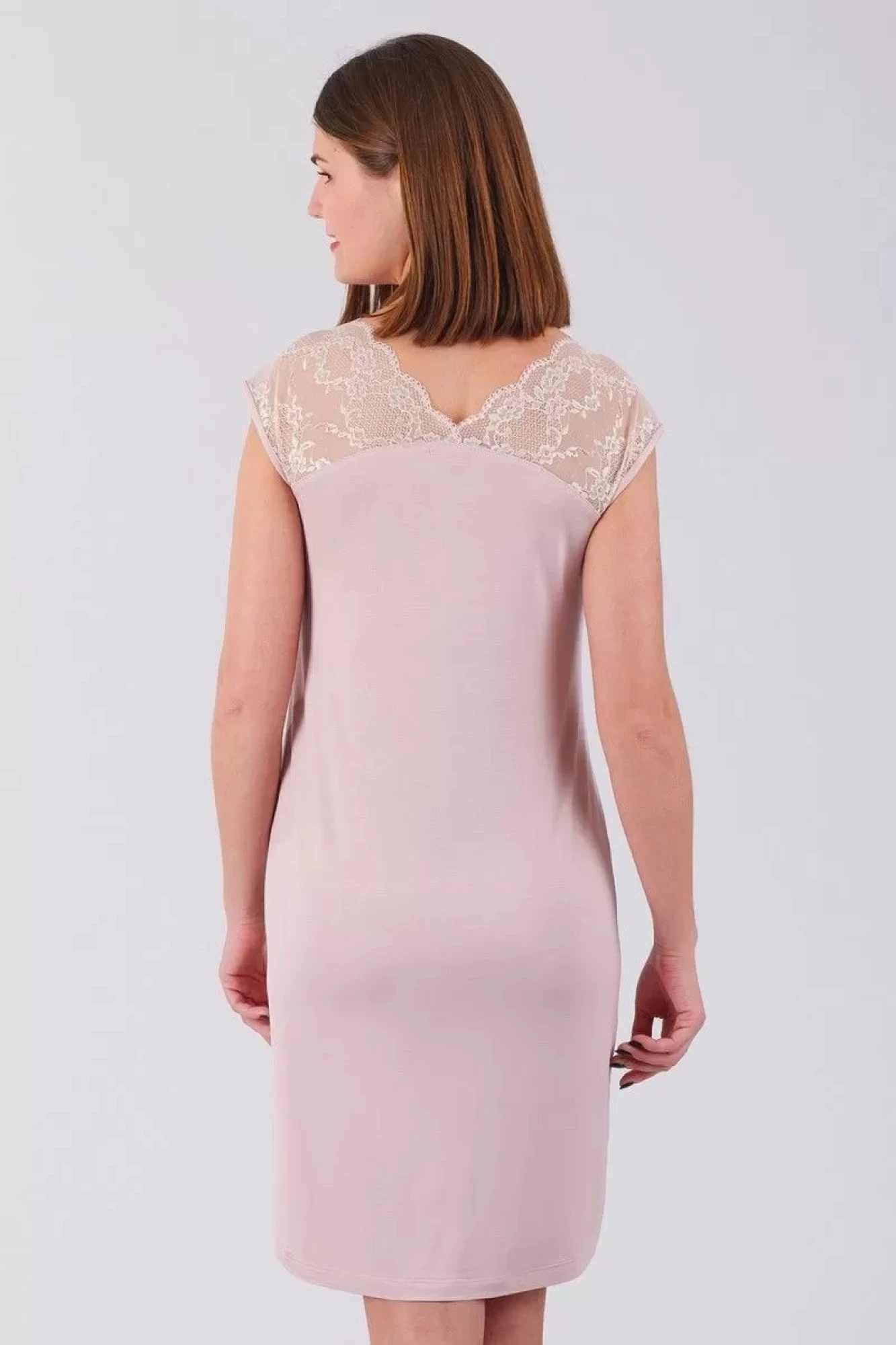 Нежная сорочка выполнена из вискозного трикотажного полотна, область плеч декорирована кружевом (пр-во Франция), плавно переходящим в V образный вырез с кружевной отделкой. Украшение - бантик с жемчужинкой.