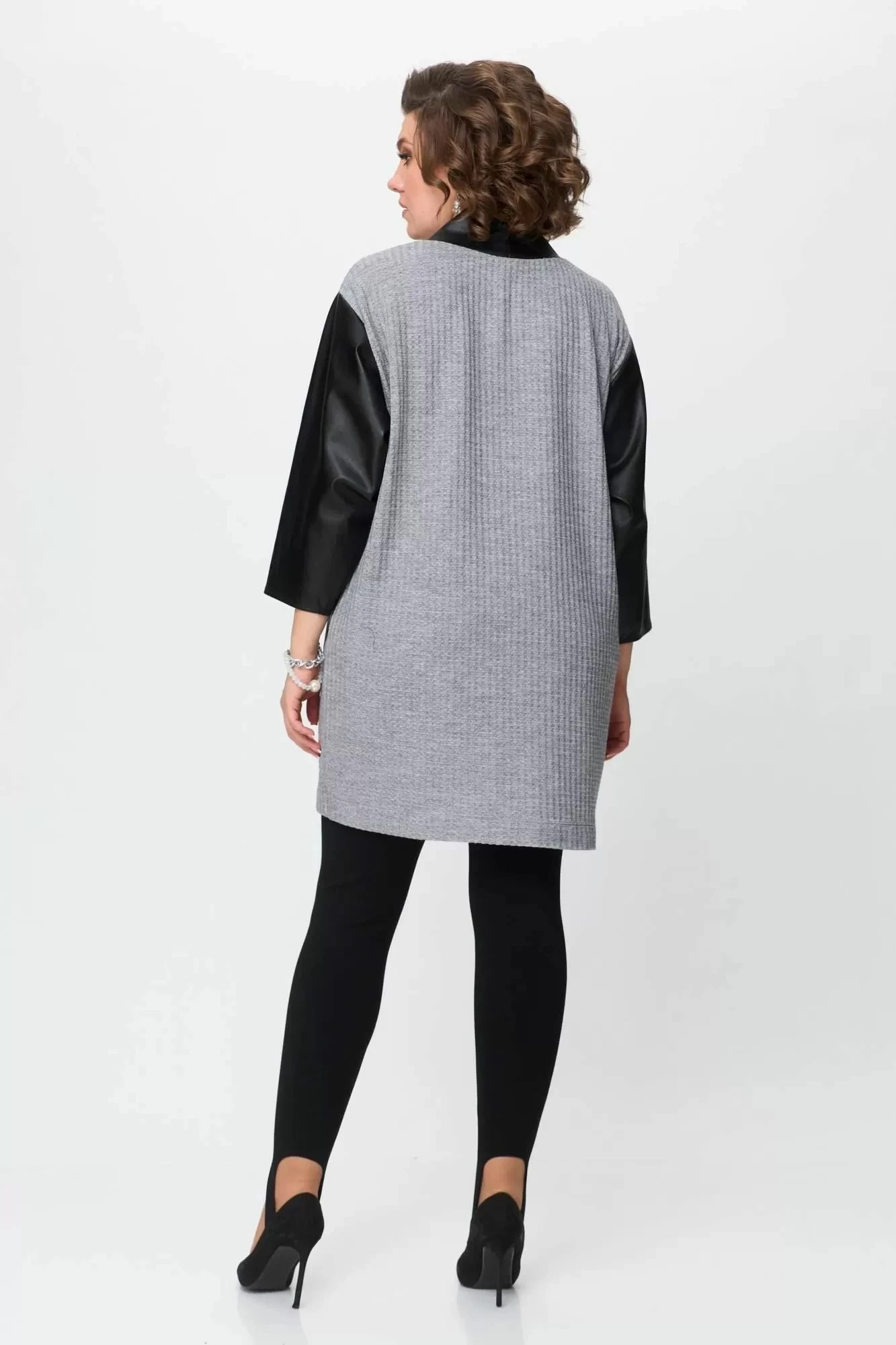 Кардиган прямого силуэта. Спинка и перед выполнены из вязаного полотна. Рукава и планка из экокожи. На переде настрочены накладные карманы из экокожи.Между передом и планкой вставлен шнур-завязка. на концах шнура черные металлические наконечники. Плечо спущенное, рукав 3/4.