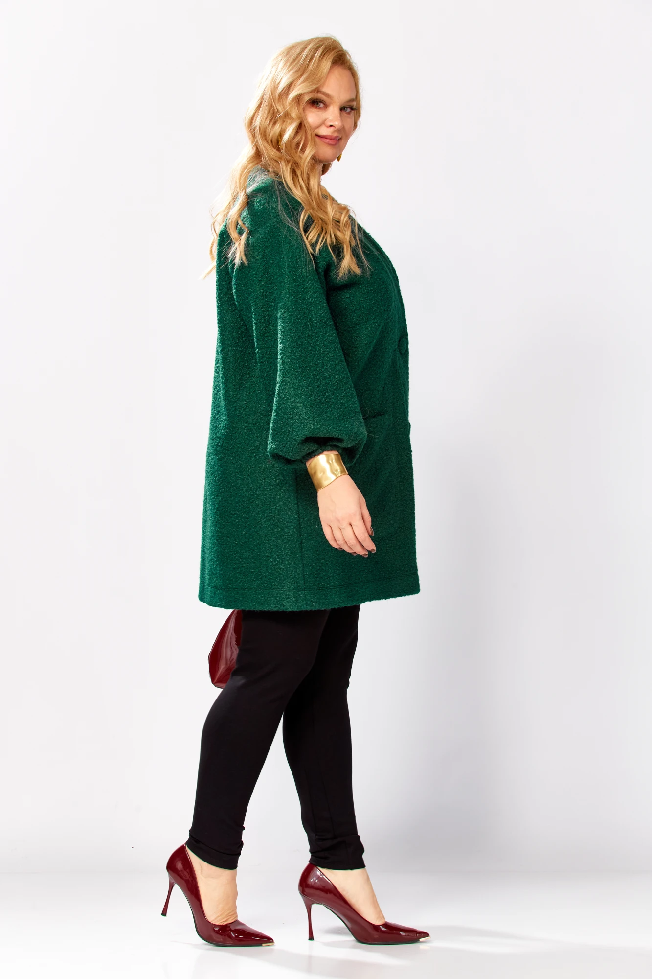 Кардиган прямого силуэта с длинным рукавом, в стиле оверсайз. Низ изделия обработан распошивалкой. По краю борта и горловинам переда и спинки притачная планка. Застежка на 3 петли и пуговицы. На переде накладные карманы, скругленной формы. Рукав длинный фонарик, по низу рукава складки и резинка. Длина по спинке(от пересечения плеча и шеи)-92см, длина плеча+планка 22,5см, длина рукава-51см.Параметры модели: обхват груди-108см, обхват бедер-114см, размер изделия на модели 56.