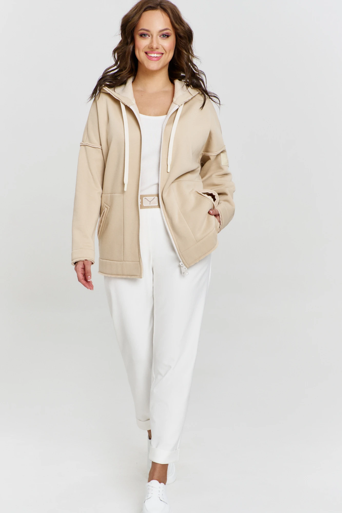 Толстовка из плотного хлопкового футера с мягкой флисовой изнанкой, с застежкой на молнию и капюшоном. Рукав длинный. Линия плеча спущена. На переде удобные прорезные карманы. В капюшоне кулиса со шнуром. Некоторые швы изделия выполнены сырым срезом на лицо.