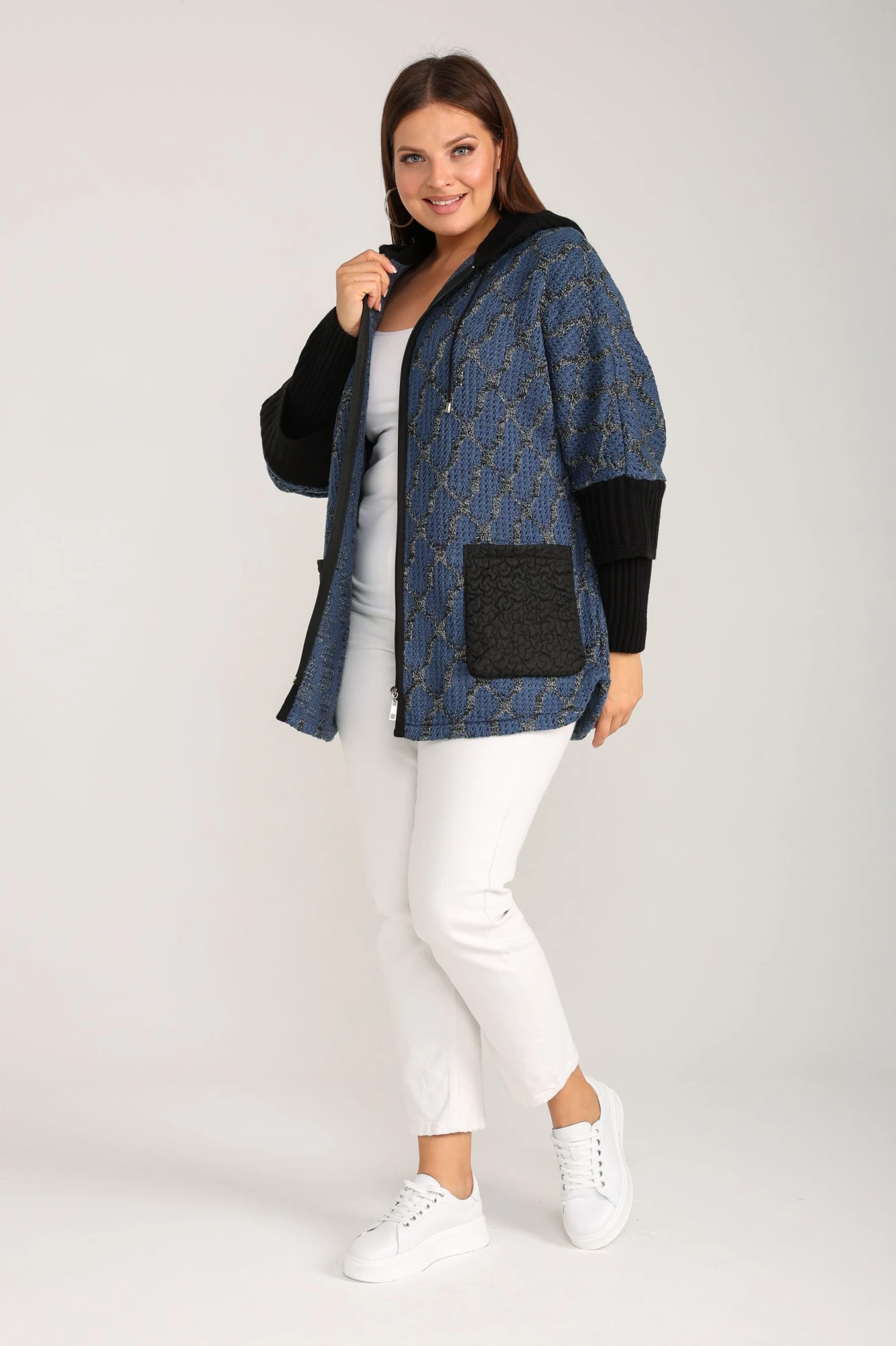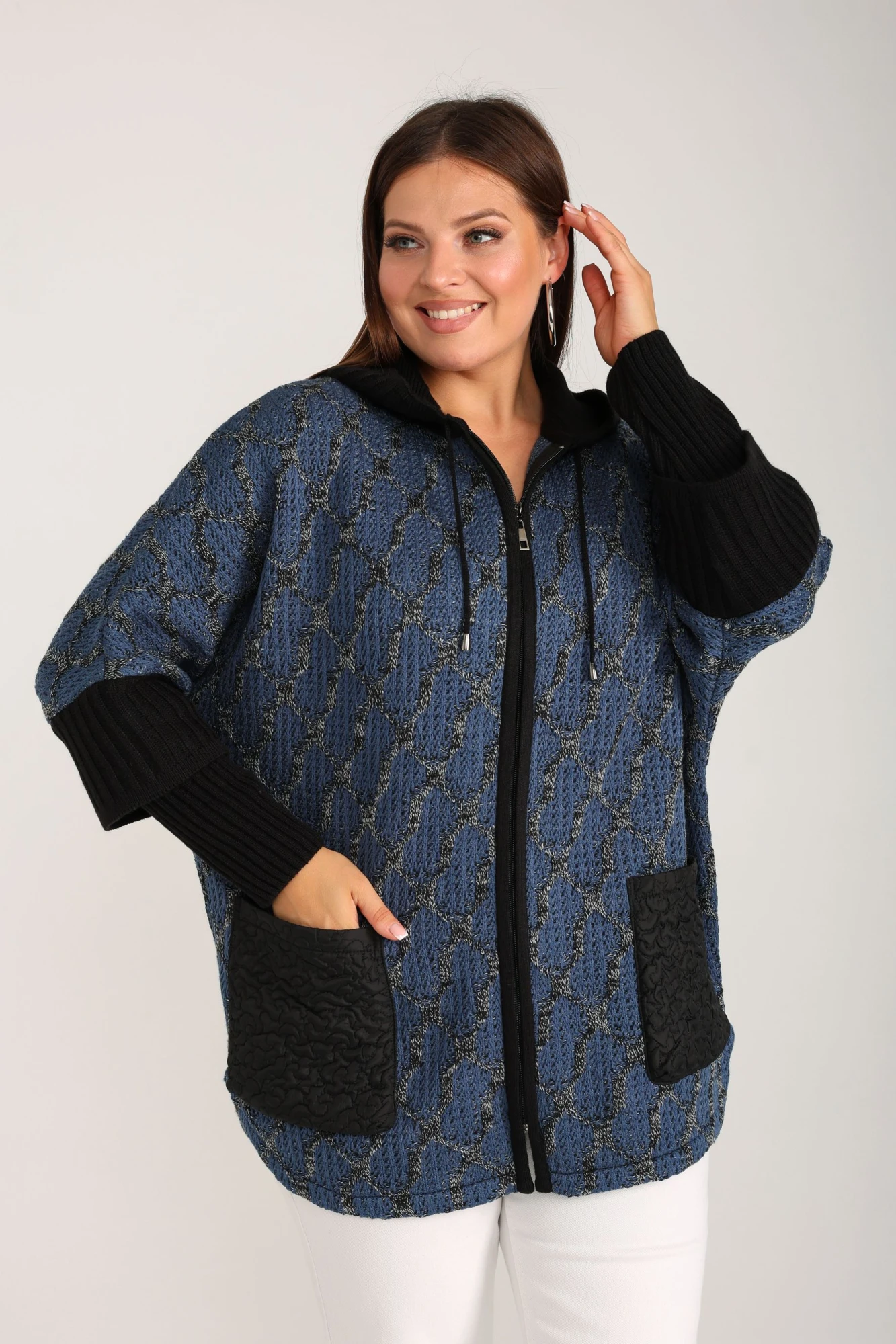 Женский кардиган - стильный предмет гардероба для модного молодежного образа! Базовую модель отличает свободный фасон - оверсайз, длинные рукава с высокими и широкими манжетами «в рубчик» и застежка на замок - молнию, глубокие накладные карманы и фигурная нижняя часть. Стильное пончо на молнии выполнено из мягкого и плотного трикотажа премиум - качества (состав: натуральная шерсть 30%, пан 70%).Универсальный кардиган с застежкой - молнией выбирают для поездок и путешествий, отдыха на природе. Красивая кофточка в женственном фасоне эстетично сочетается с обувью в классическом или спортивном стиле, подходит дамам с любым типом фигуры.