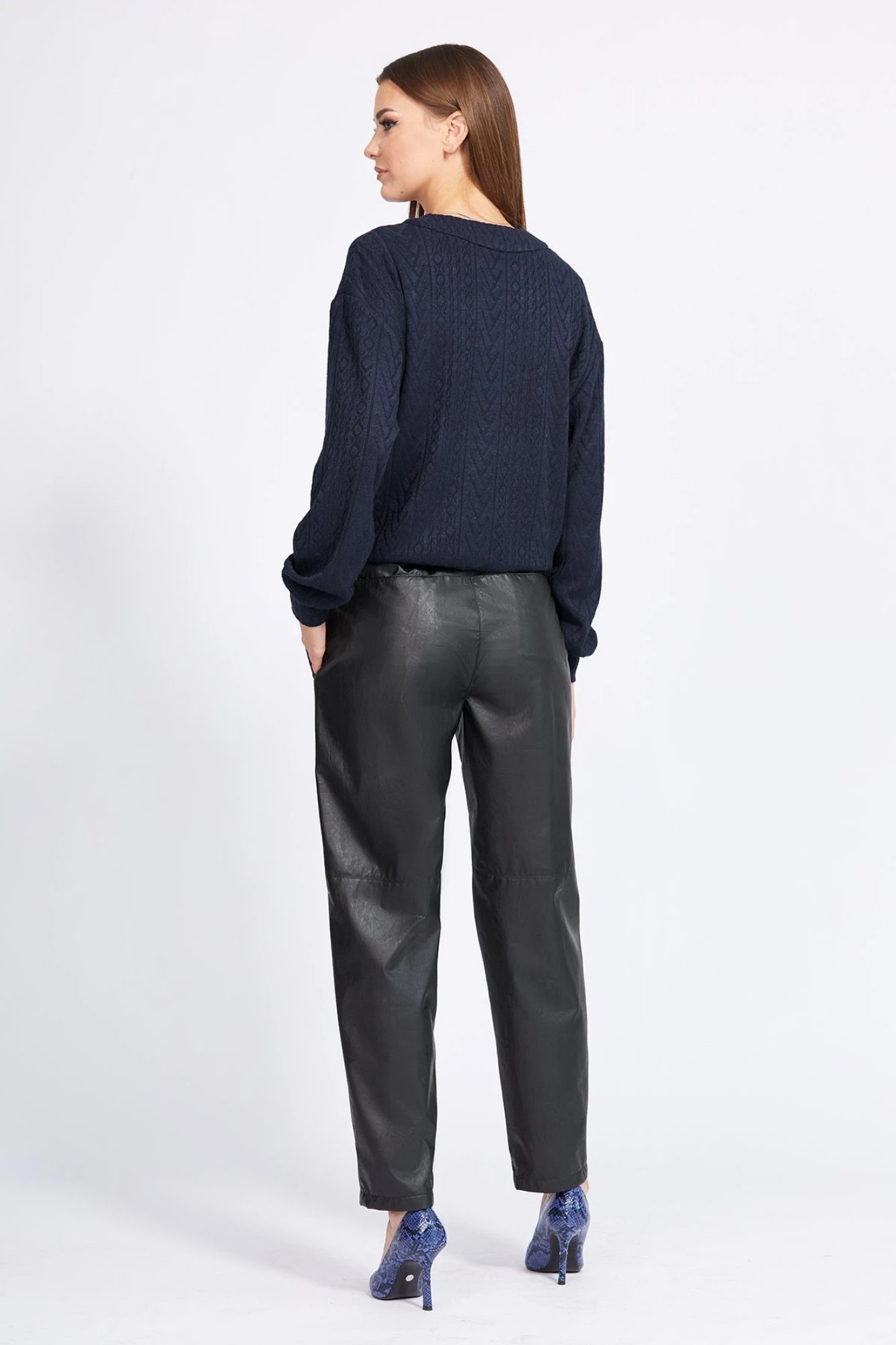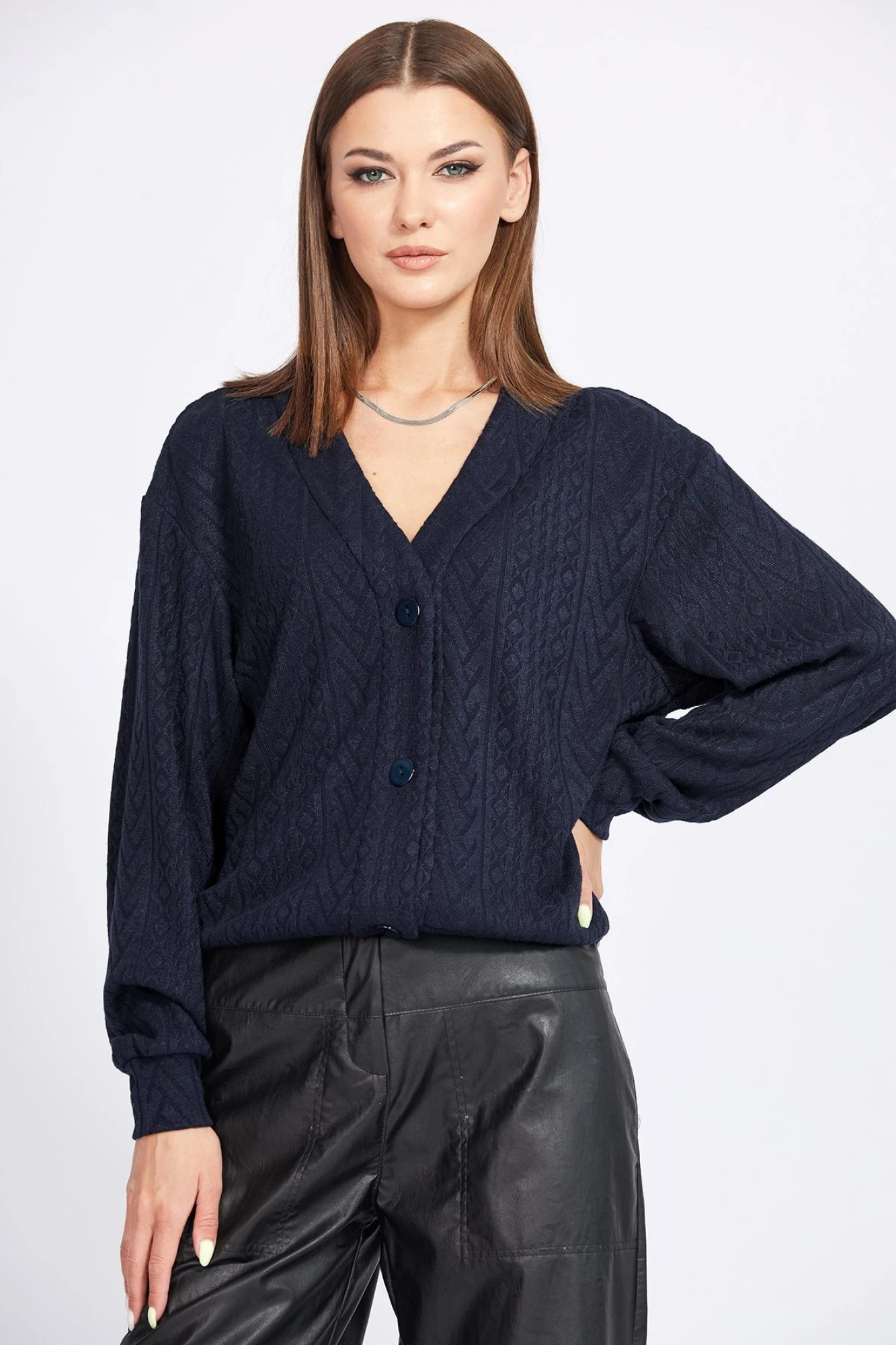 Кардиган выполнен из трикотажного полотна "в косичку". Кардиган свободного кроя, длиной выше линии бедер. Застежка спереди на пуговицы. Спинка цельная. Горловина спереди V-образной формы. Плечевой шов спущен. Рукав одношовный, присборенный по низу. Низ рукава на притачной манжете. Низ кардигана присборен на притачной пояс из основной ткани.