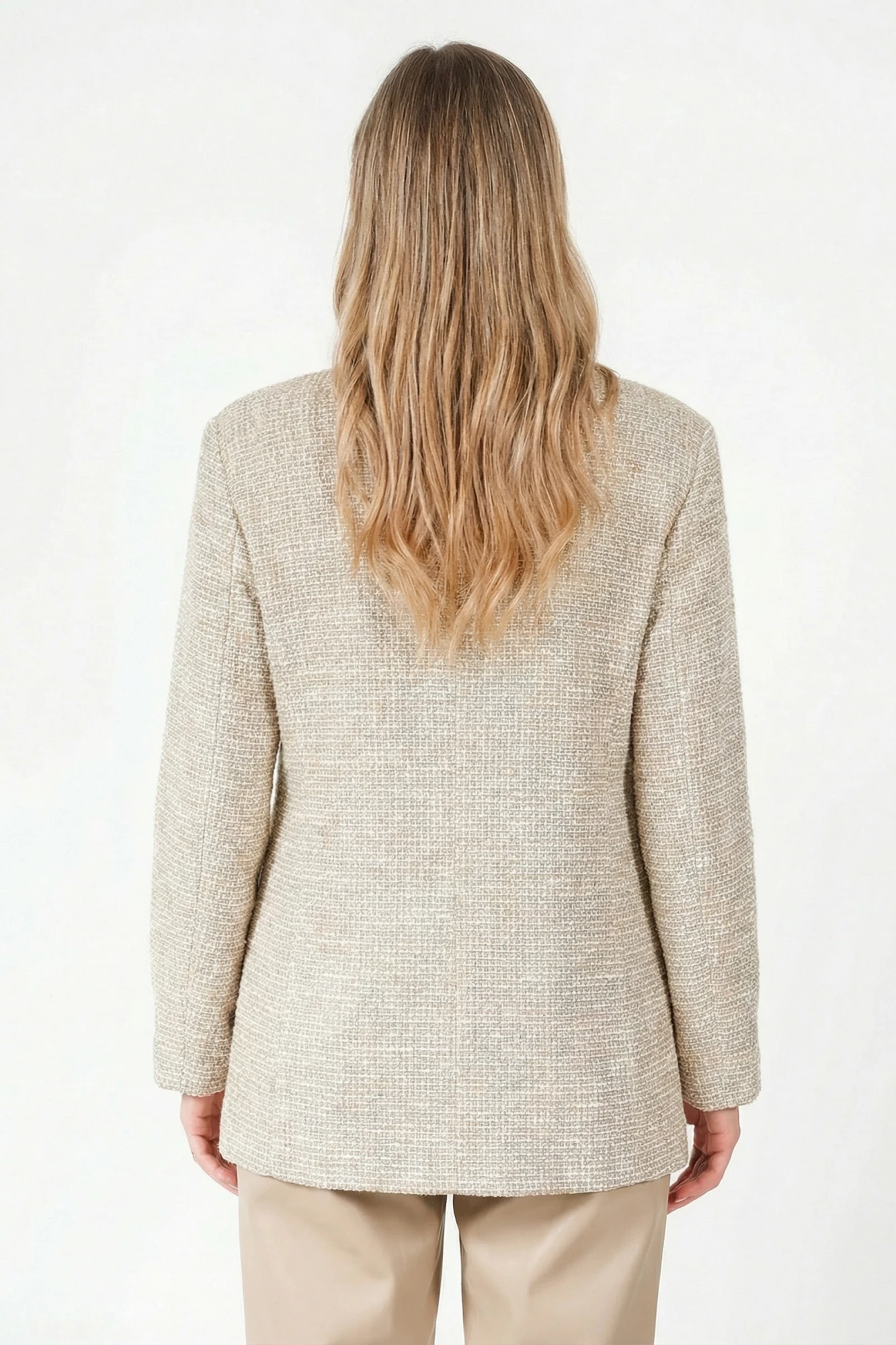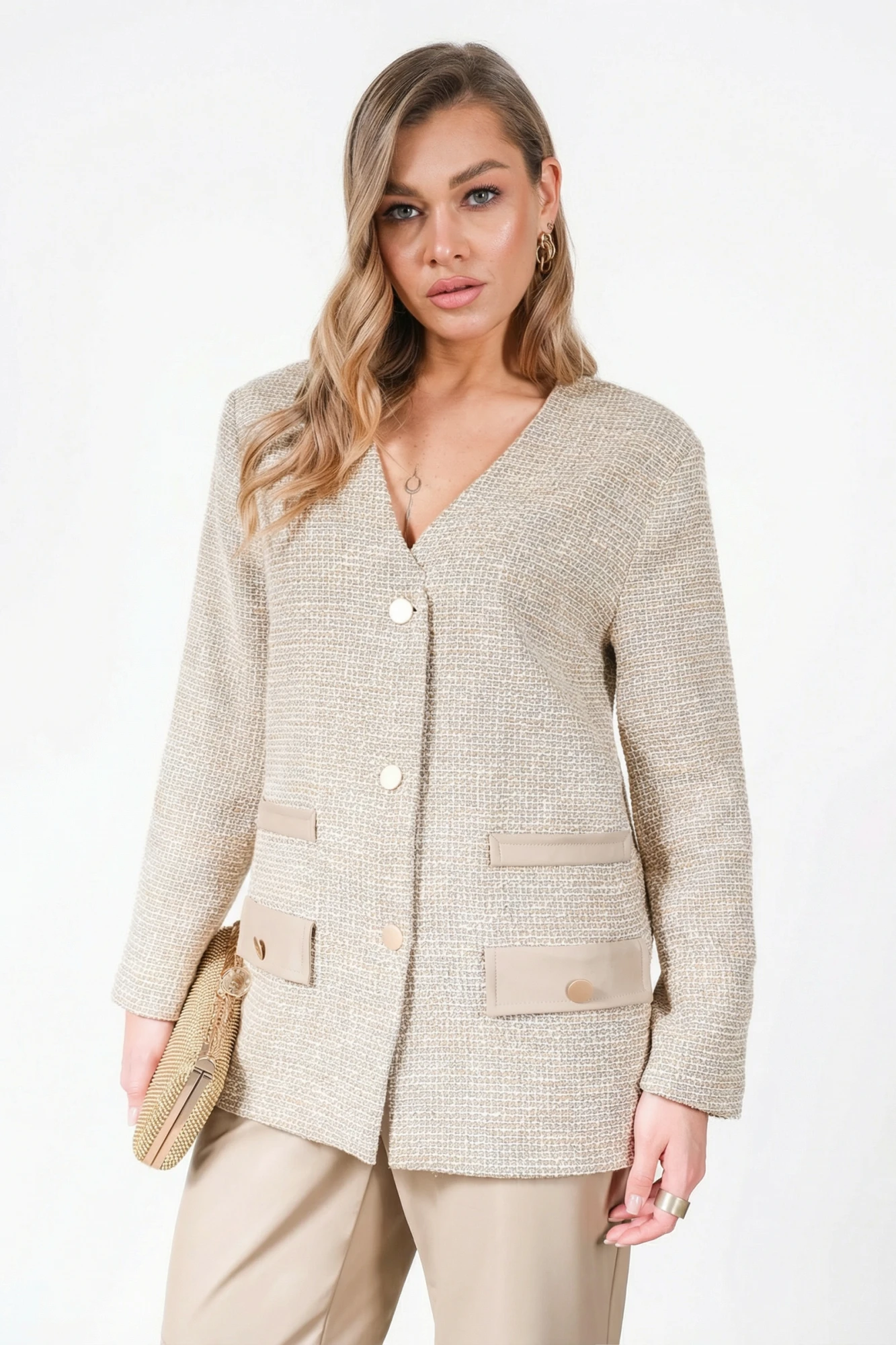 Жакет женский, полуприлегающего силуэта. Застежка на петли и пуговицы. По переду декоративные клапаны из кожи, которые добавляют динамики и современного звучания, подчеркивая ваш вкус к нетривиальным решениям..Втачной рукав обеспечивает безупречную архитектуру плеча, что особенно важно для жакета. Жакет выполнен на подкладке.