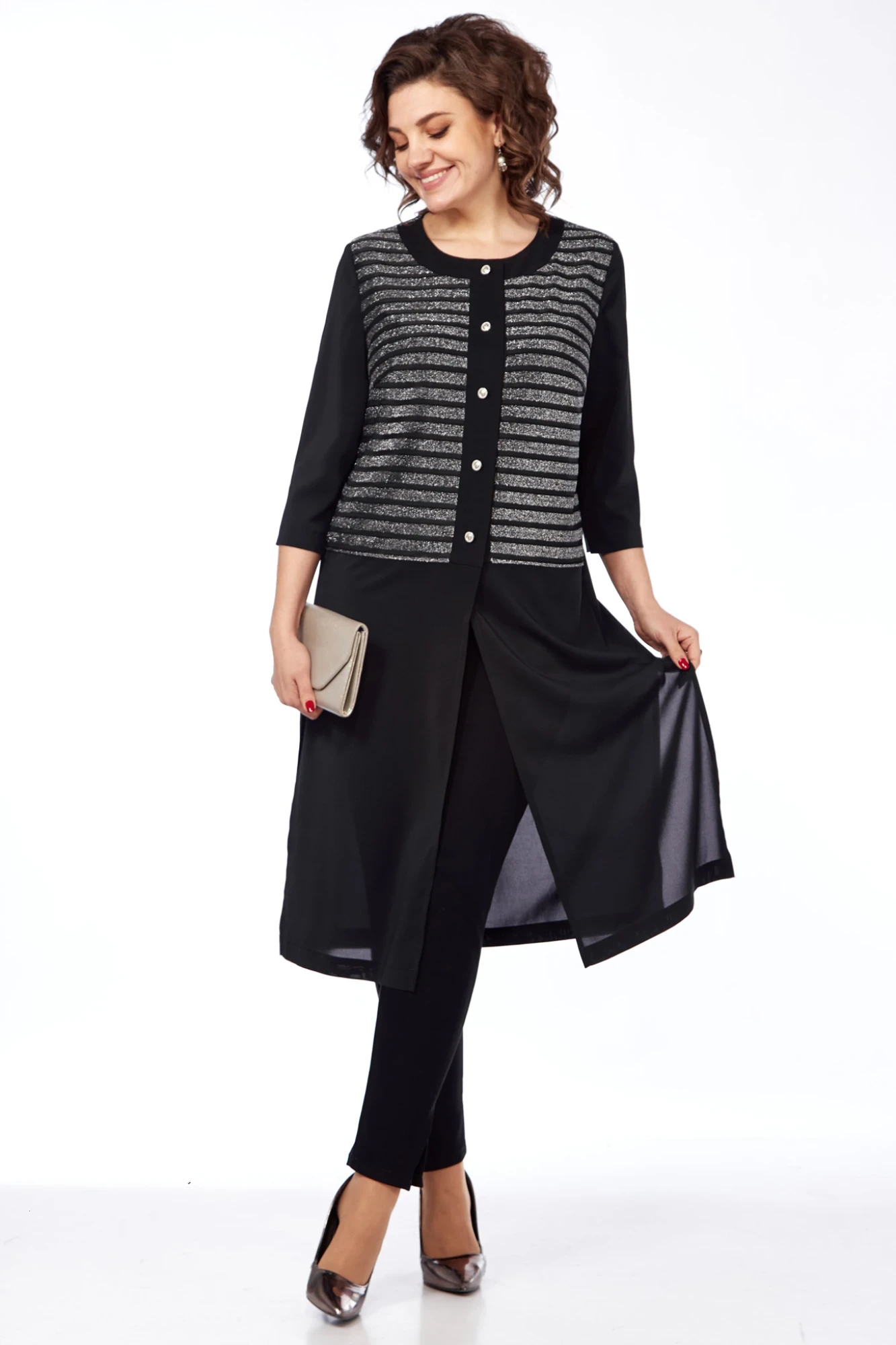 Кардиган женский, прямого силуэта, отрезной на полочке по линии бедер. Верхняя передняя часть выполнена из полоски с люрексом. Застежка центральная на петли-пуговицы, с планкой. Нагрудные вытачки. Горловина круглая,обработана отрезной планкой. Рукав втачной, одношовный 3/4. Спинка с отрезной кокеткой. По спинке сборка.