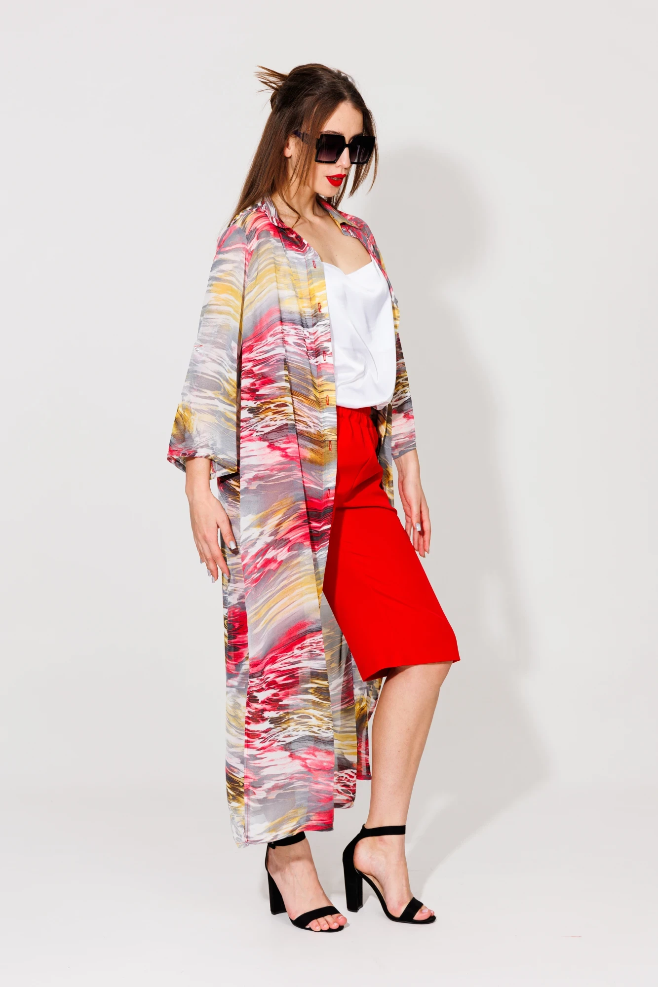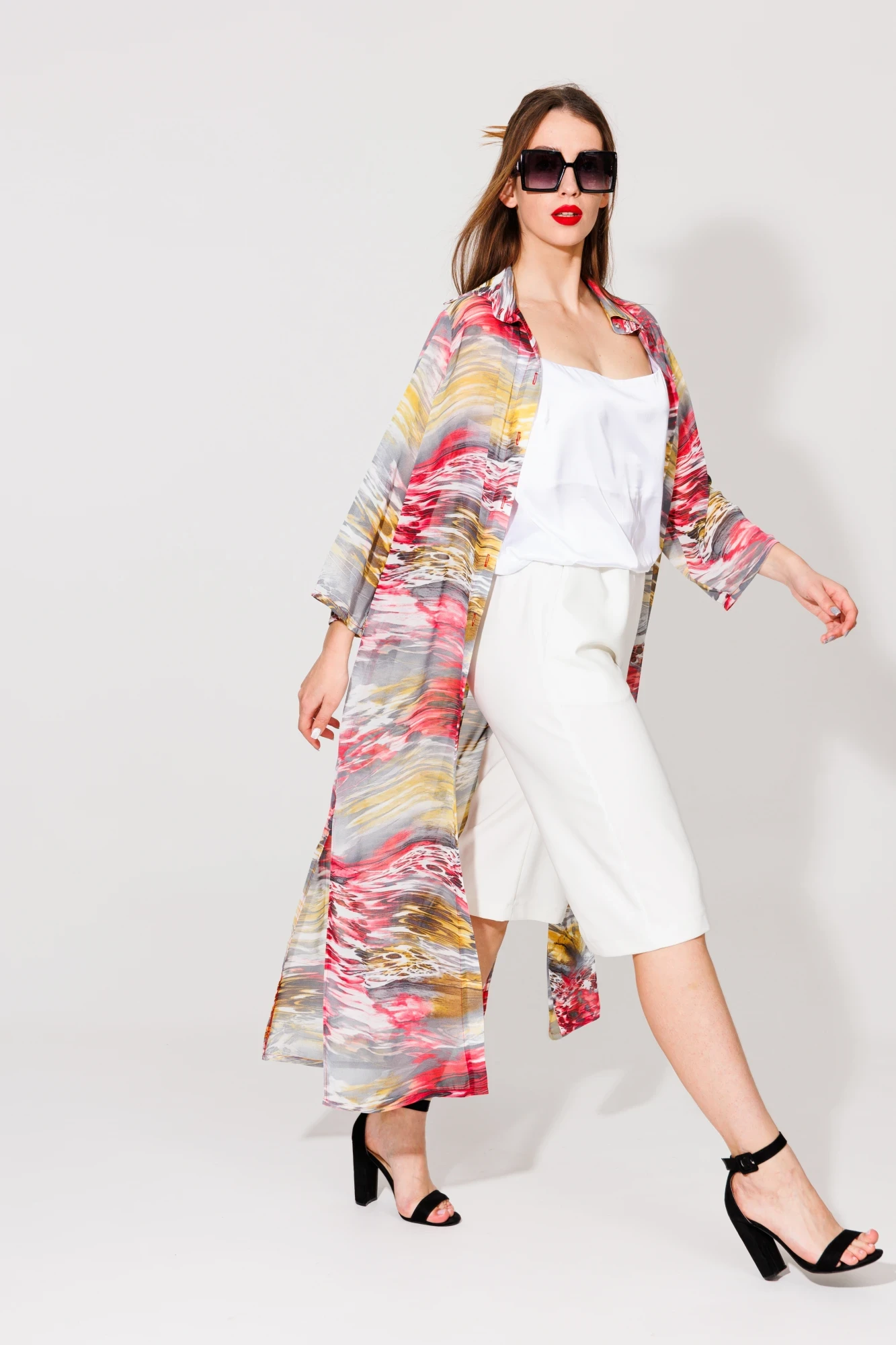 Кардиган прямого кроя с акцентным принтом. Горловина обработана рубашечным воротником с отрезной стойкой. Модель со слегка приспущенной линией плеча и рукавами длиной 7/8. Застёжка центральная на петли и пуговицы. По низу изделия разрезы.