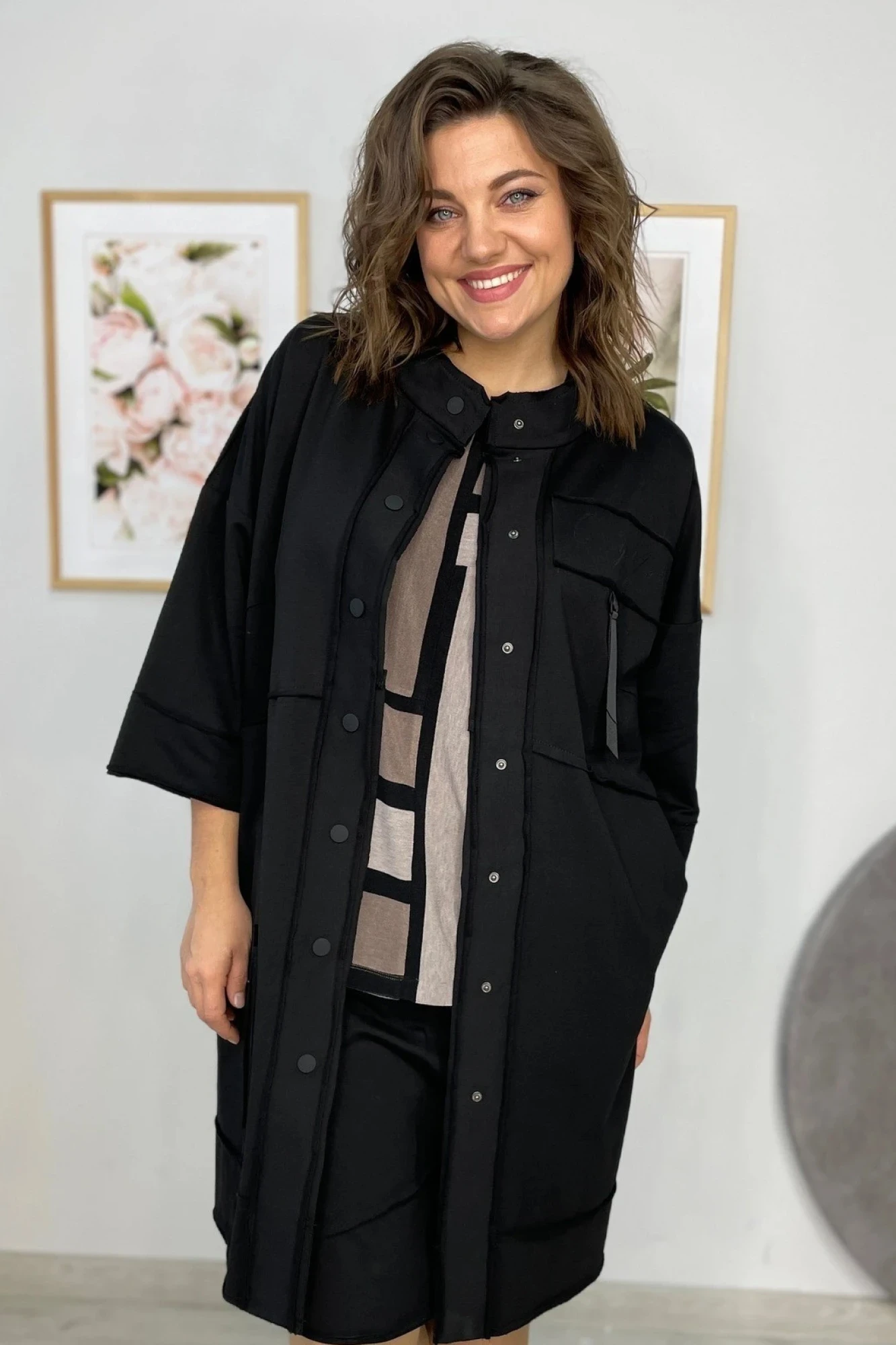 Кардиган женский прямого силуэта из трикотажной ткани (двунитка-футер). На полочке и спинке расположены декоративные, необработанные швы. В верхней и нижней части переда есть настрочные элементы с печатью и тесьмой. По переду изделия карманы. Спинка со средним швом и кокеткой. На кокетке расположен элемент с печатью и тесьмой. Рукав спущенный с манжетой. Вырез горловины оформлен стойкой. По переду изделия планка с кнопками.