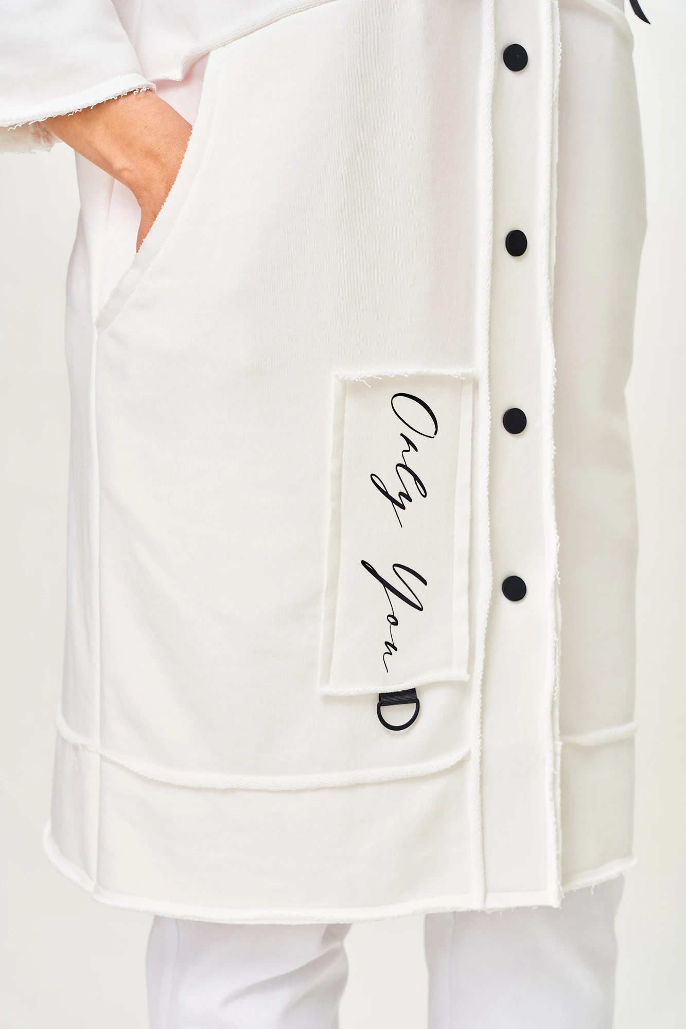 Кардиган женский прямого силуэта из трикотажной ткани (трехнитка-футер). На полочке и спинке расположены декоративные, необработанные швы. В верхней и нижней части переда есть настрочные элементы с печатью и тесьмой. По переду изделия карманы. Спинка со средним швом и кокеткой. На кокетке расположен элемент с печатью и тесьмой. Рукав спущенный с манжетой. Вырез горловины оформлен стойкой. По переду изделия планка с кнопками.